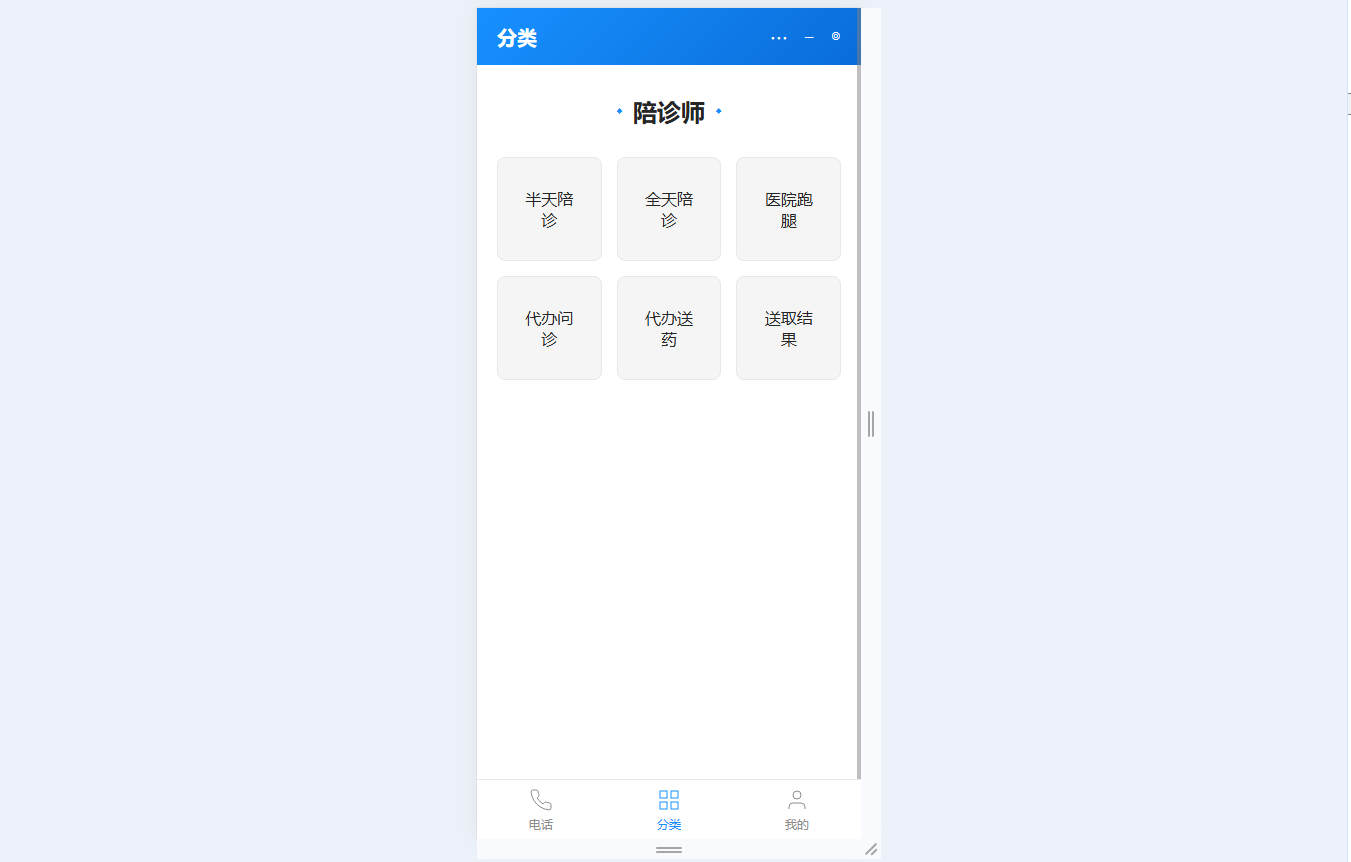 ● 服务分类与跳转:8大服务分类图标入口,点击自动筛选对应陪诊师,分类与陪诊师数据联动,支持多服务类别配置