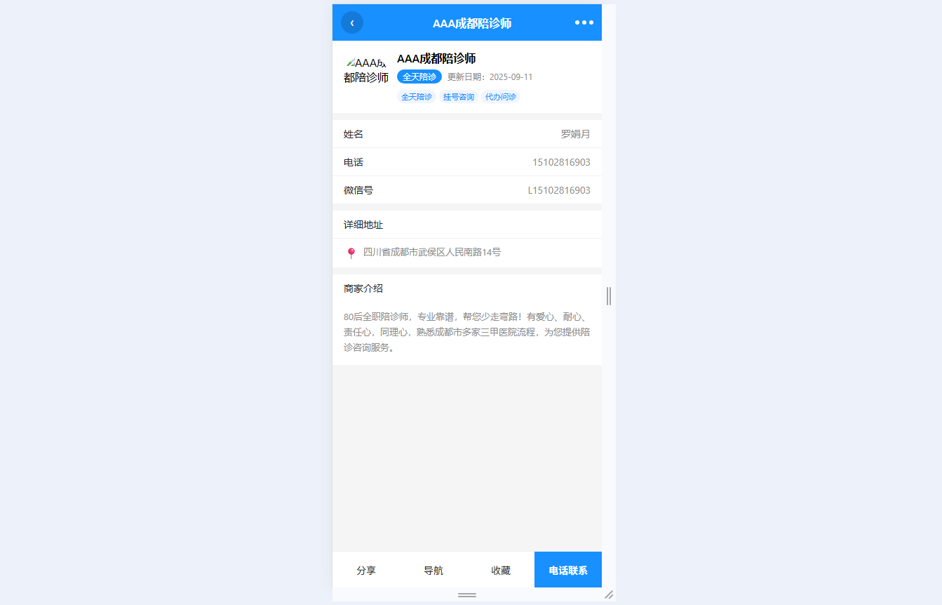 ● 陪诊师详情展示:呈现头像、姓名、服务标签等完整信息,底部操作栏支持分享、导航、收藏/取消及电话联系