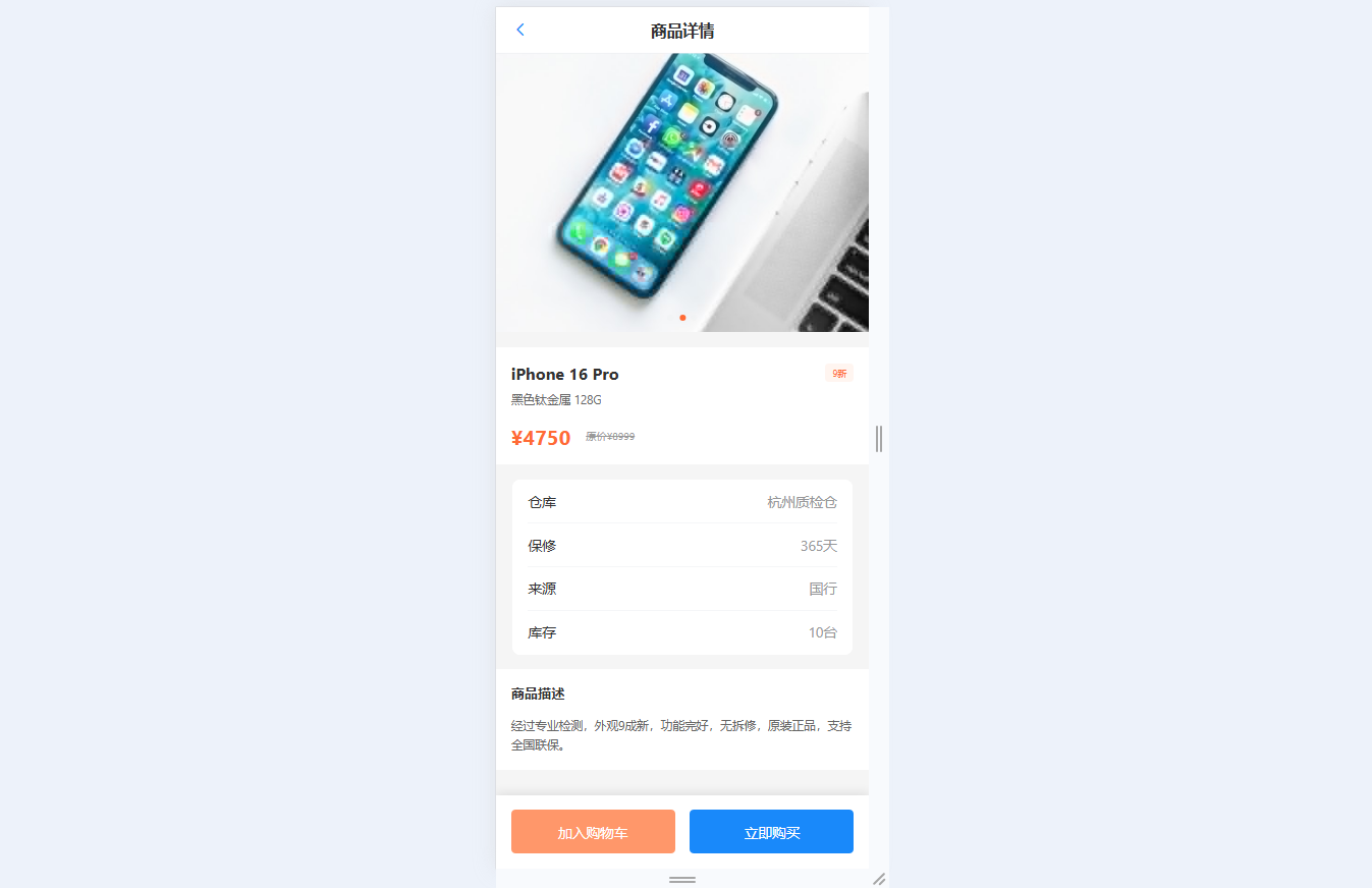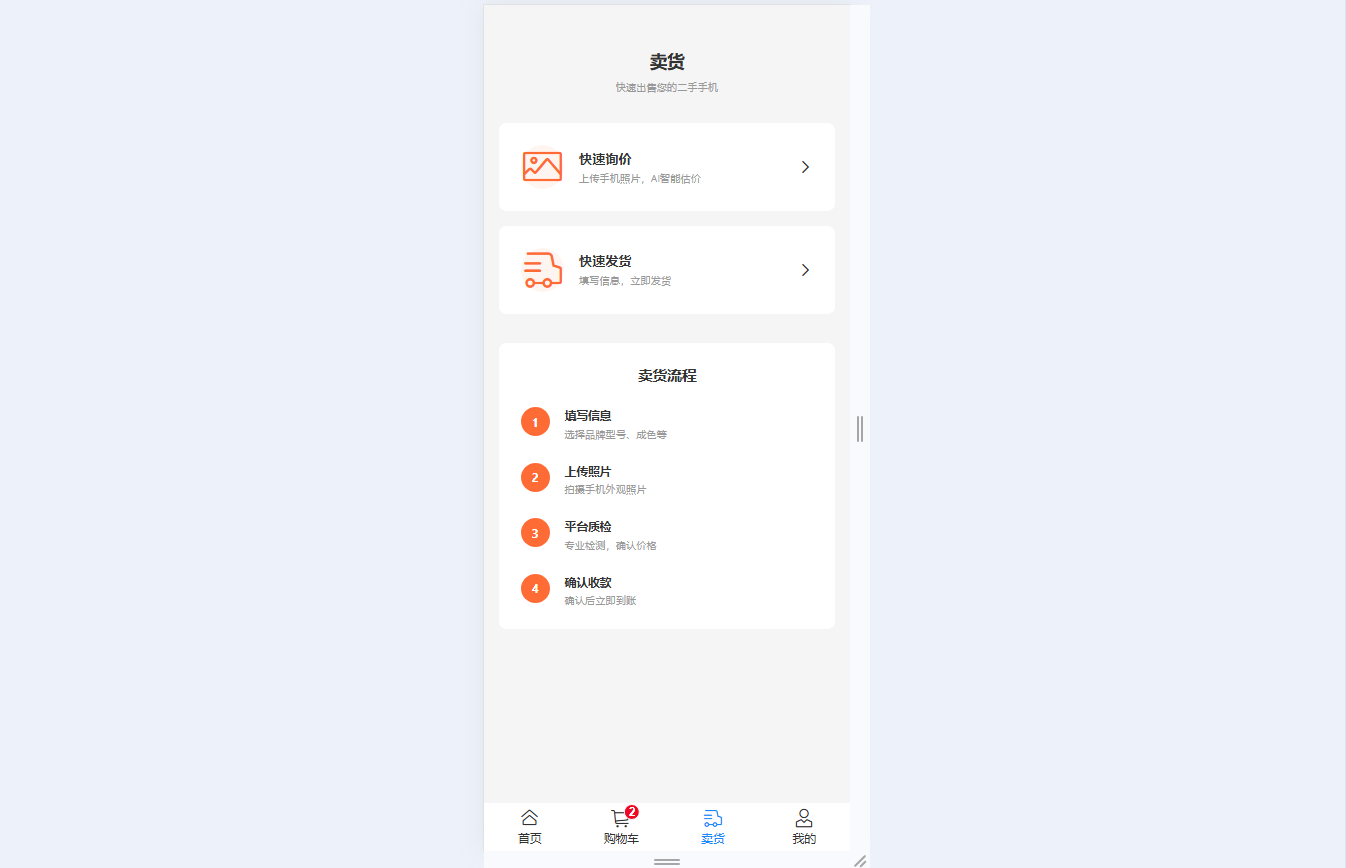 ● 卖货便捷服务:快速询价支持上传5张照片+填写设备信息,AI智能估价(模拟),快速发货含信息填写与流程指导,4步卖货流程清晰指引