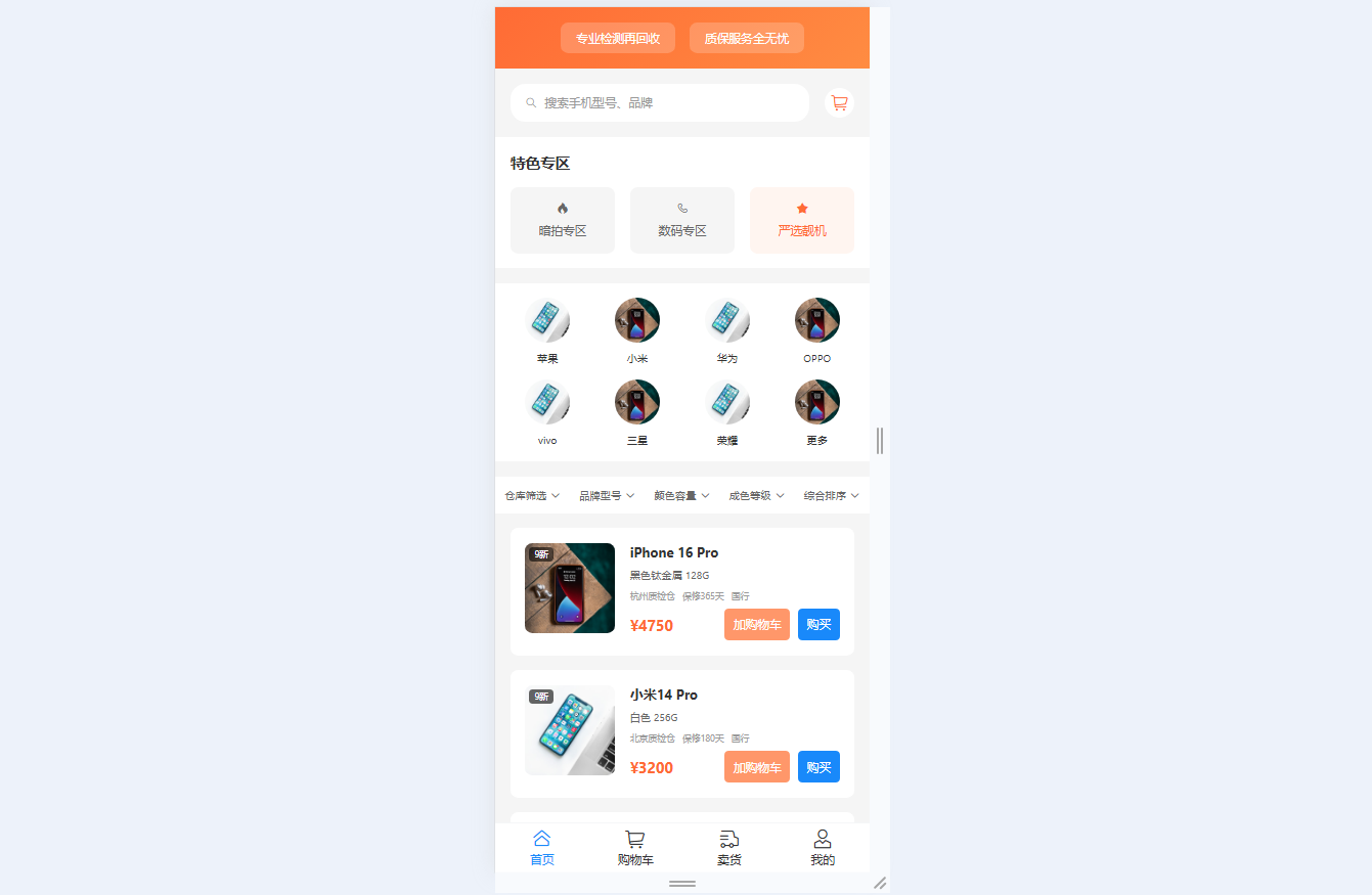 ● 首页综合服务:突出专业质检与质保服务,设暗拍/数码/严选靓机专区,支持苹果/华为等主流品牌分类,多维度筛选(仓库/成色等),商品展示型号、价格等信息,支持一键加购与立即购买