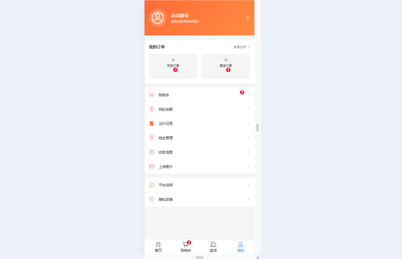 ● 个人中心管理:手机号验证码登录/注册,用户信息管理,买货/卖货订单快速访问(带数量徽章),余额查看/充值/提现,地址与收款信息管理,平台说明与隐私政策查阅
