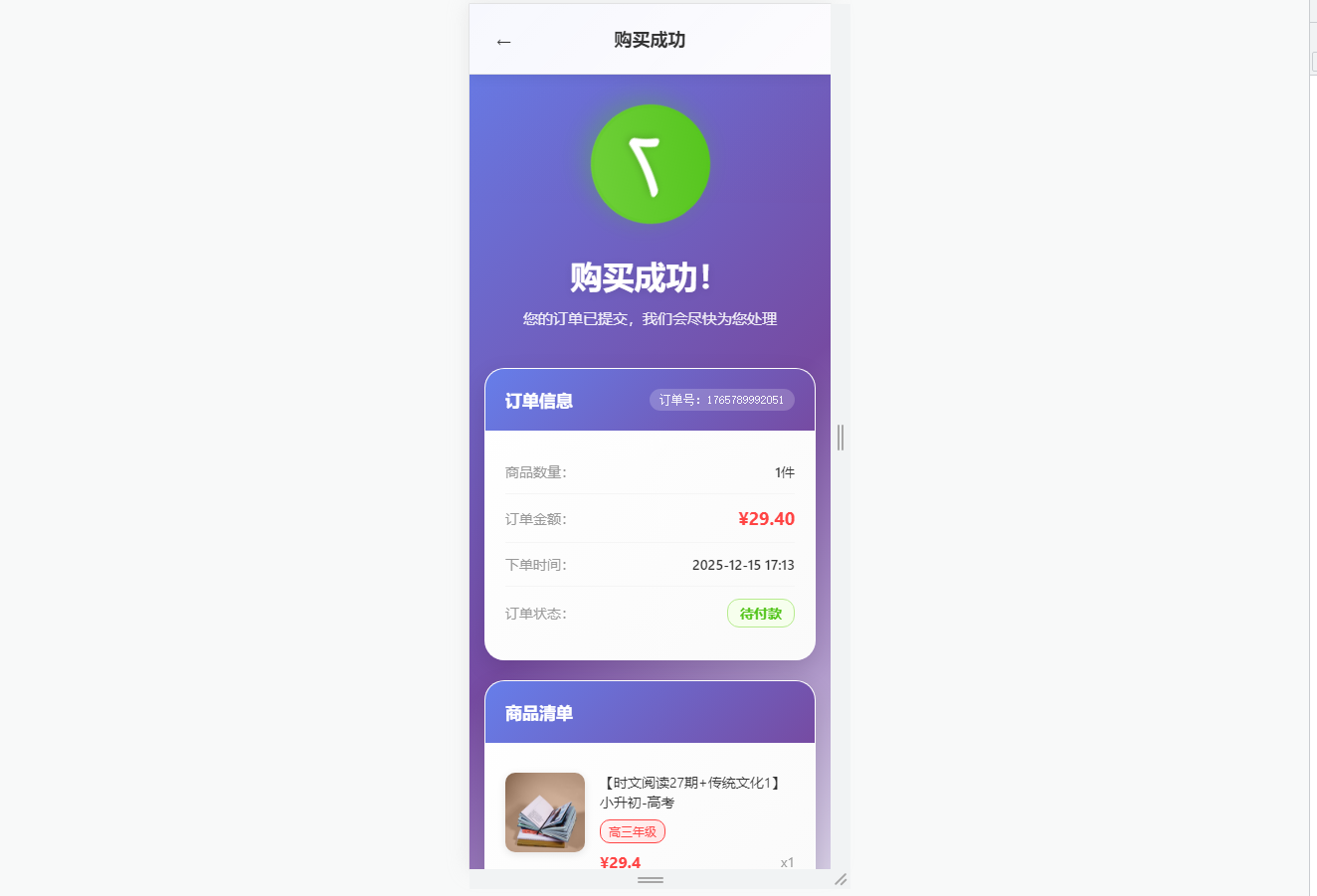 ● 购买成功反馈:支付完成后展示精美动画,呈现订单号、商品清单等详情,提供查看订单和继续购物引导