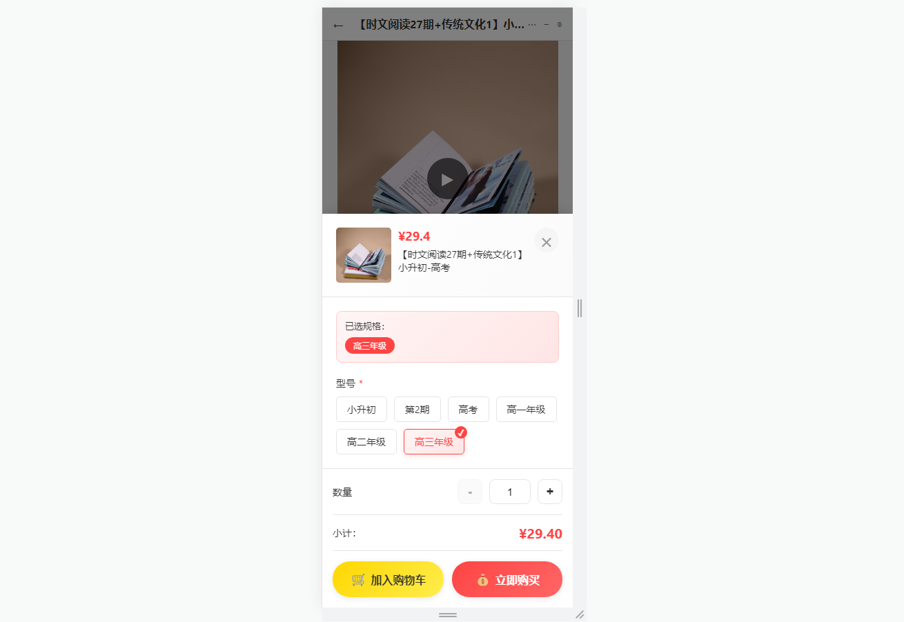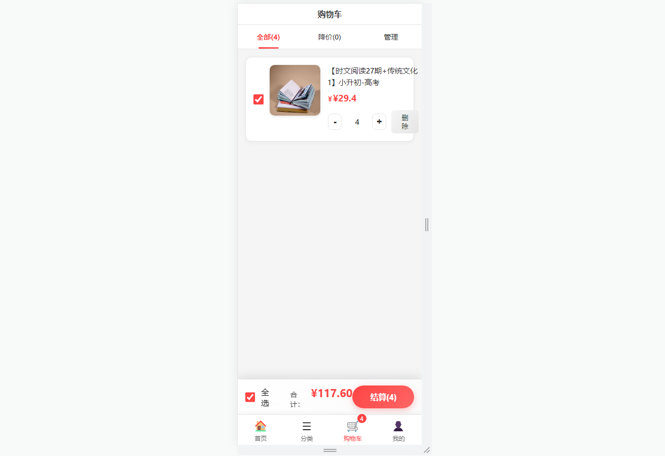 ● 购物车管理:支持商品添加、规格展示、数量调整与删除,自动实时计算总价和商品总数,支持批量结算