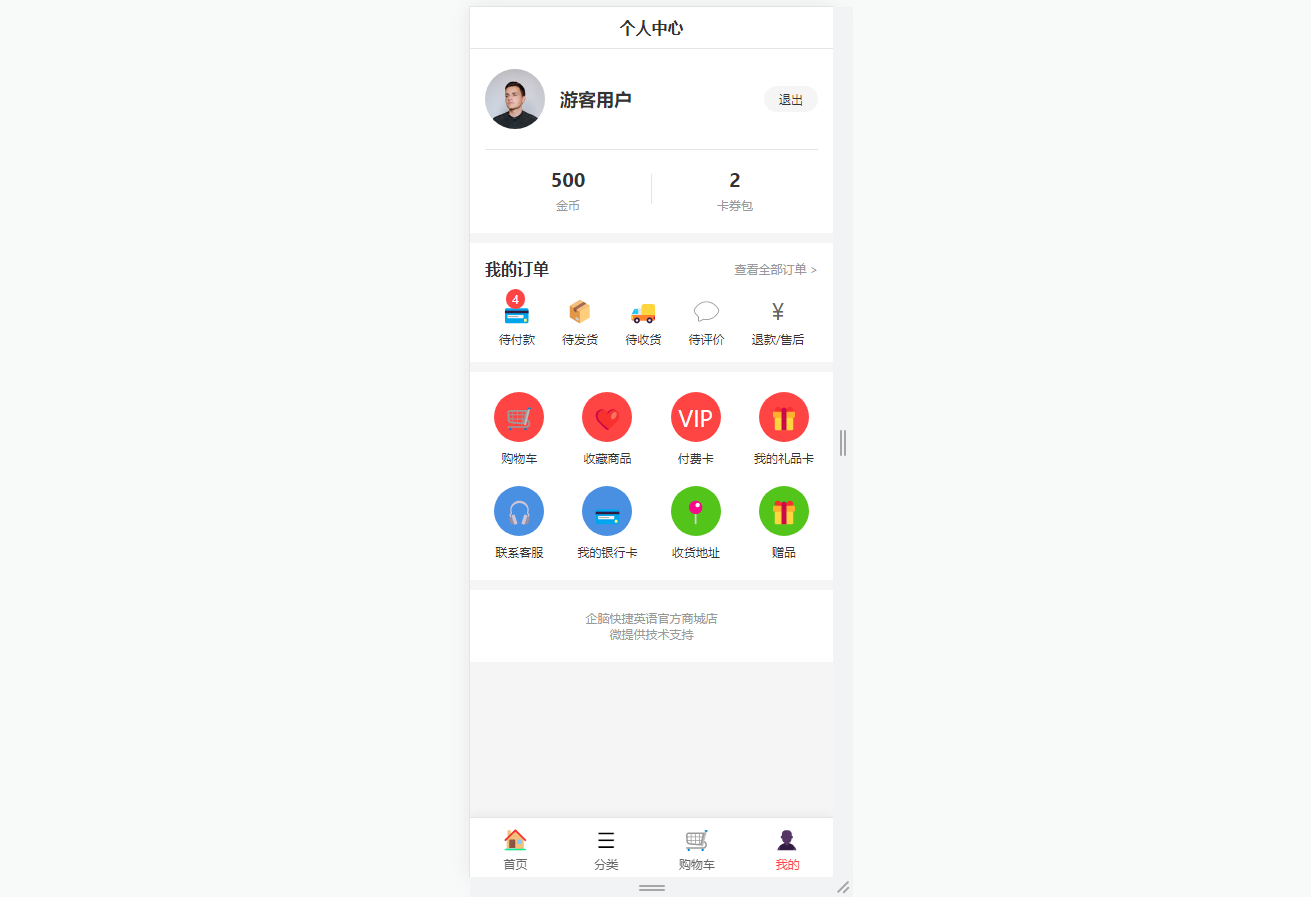 ● 用户中心:支持用户登录注册,展示个人信息、企豆余额与卡券数量,提供订单统计及购物车、收藏等服务入口