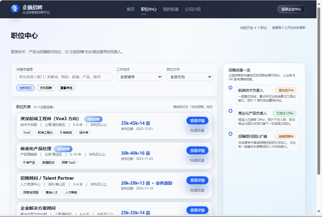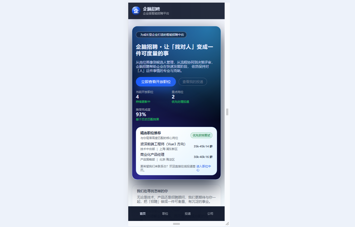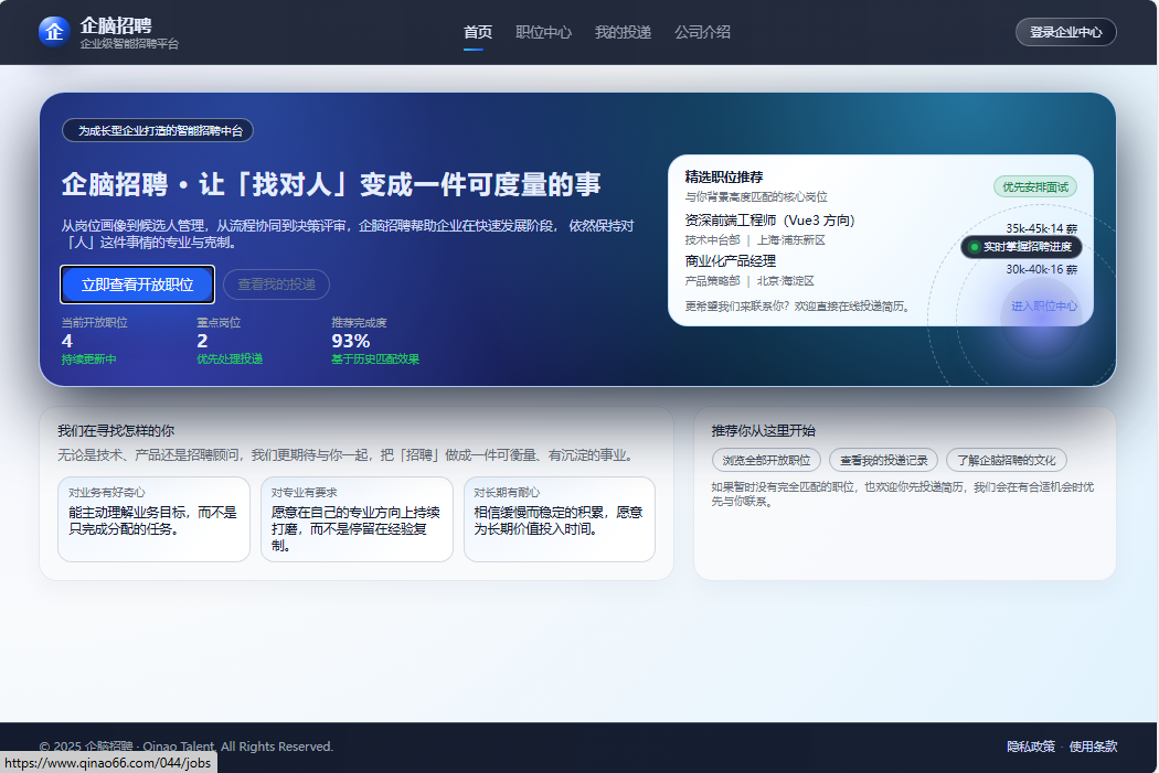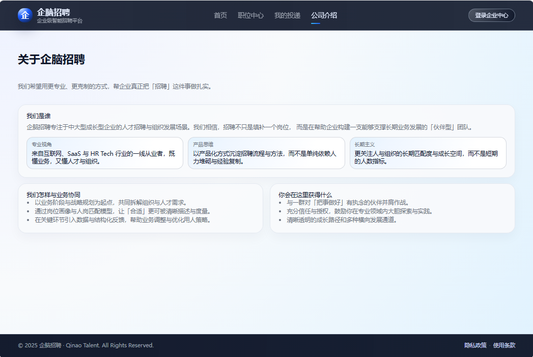 ● 雇主品牌展示:介绍公司定位、价值观与人才发展资源,构建专业的雇主品牌形象,吸引优质候选人