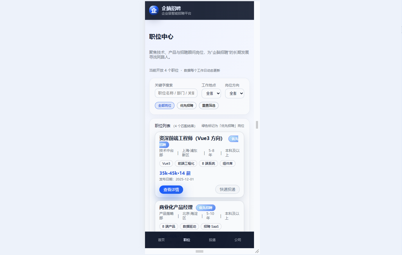● 职位搜索与筛选:支持关键字模糊检索,工作地点、岗位方向等多维度组合筛选,关键岗位可标记“优先招聘”提升优先级