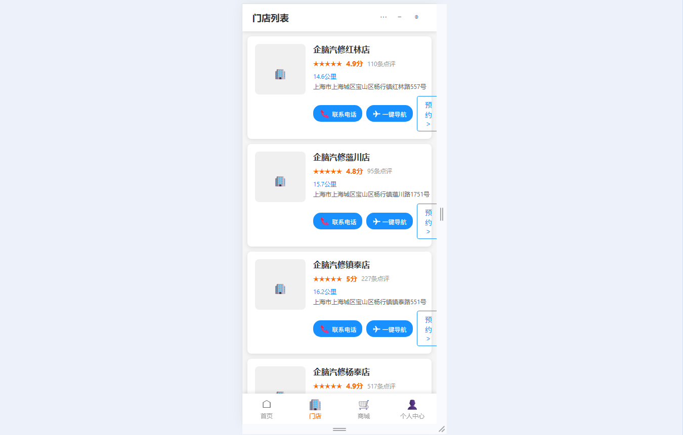 ● 门店服务预约:展示门店名称、评分、距离等信息,支持一键导航和电话联系,在线选择日期时段、车辆及服务项目完成预约,可查看或取消预约记录