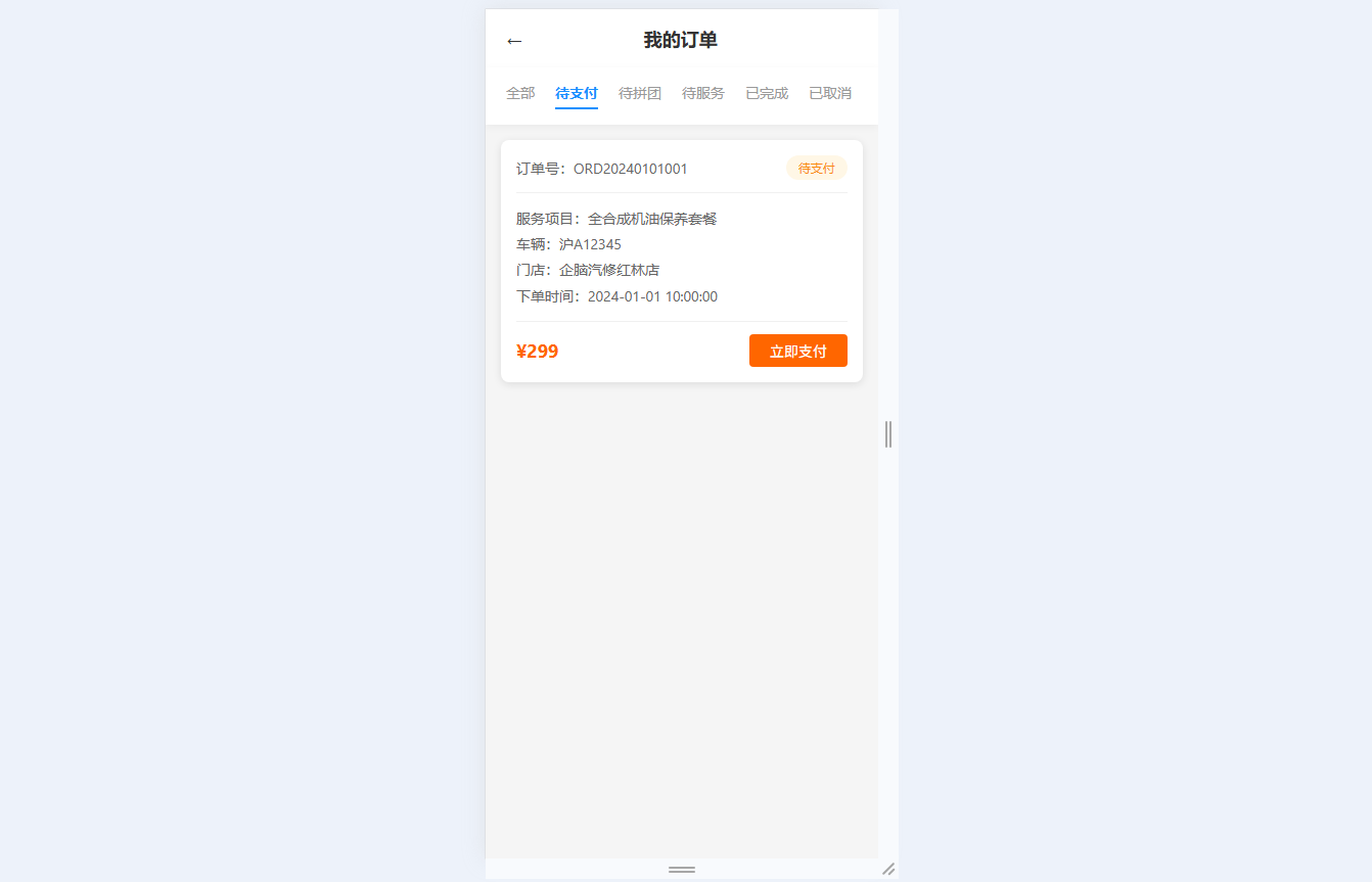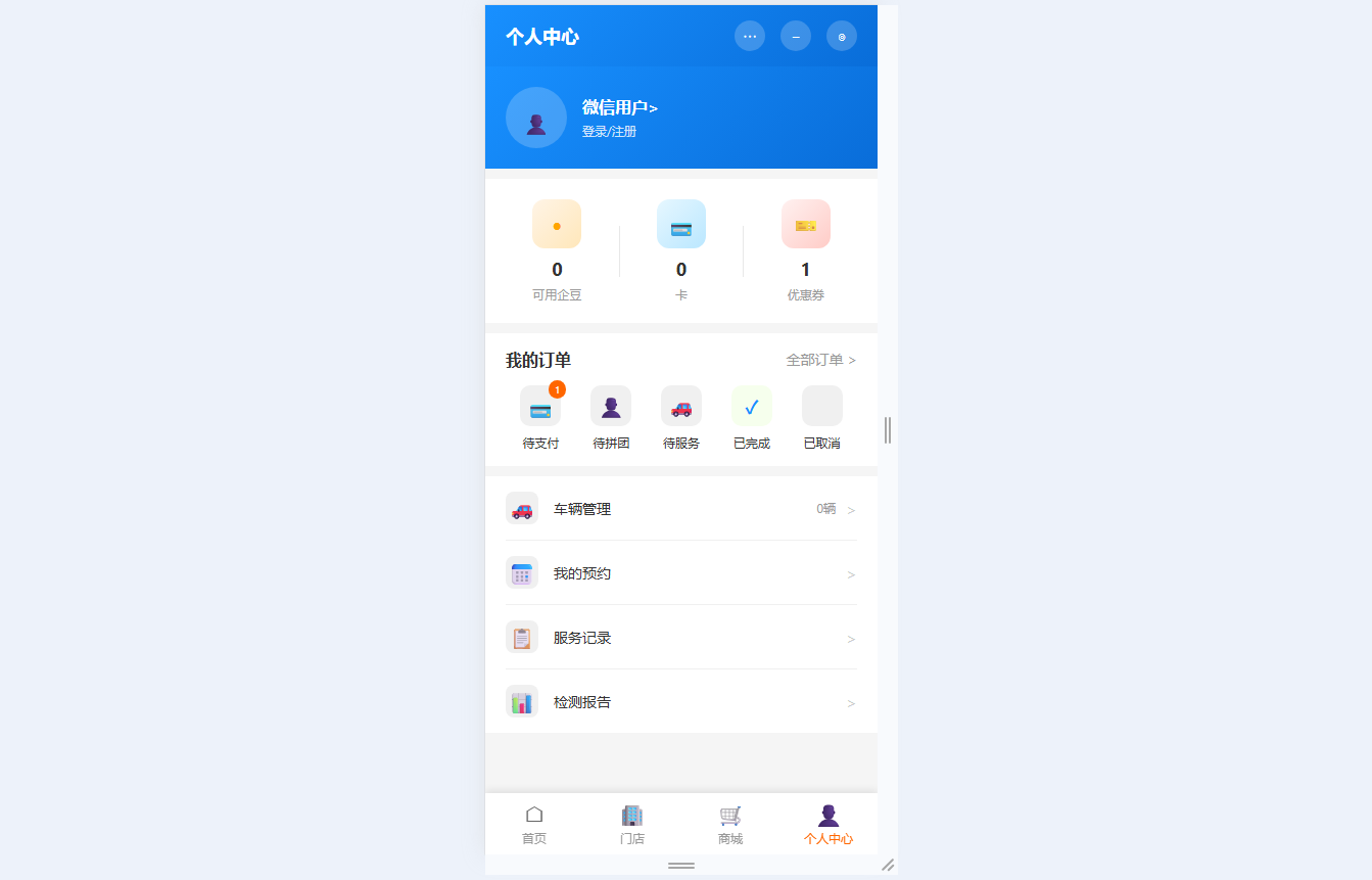 ● 个人中心服务:管理用户登录注册信息,查看企豆余额与卡券数量;按多状态分类管理订单并支持支付、评价等操作;维护车辆信息、预约记录、服务记录及检测报告