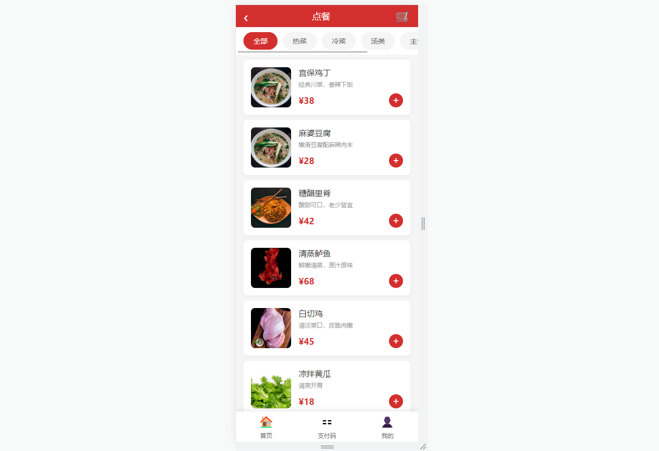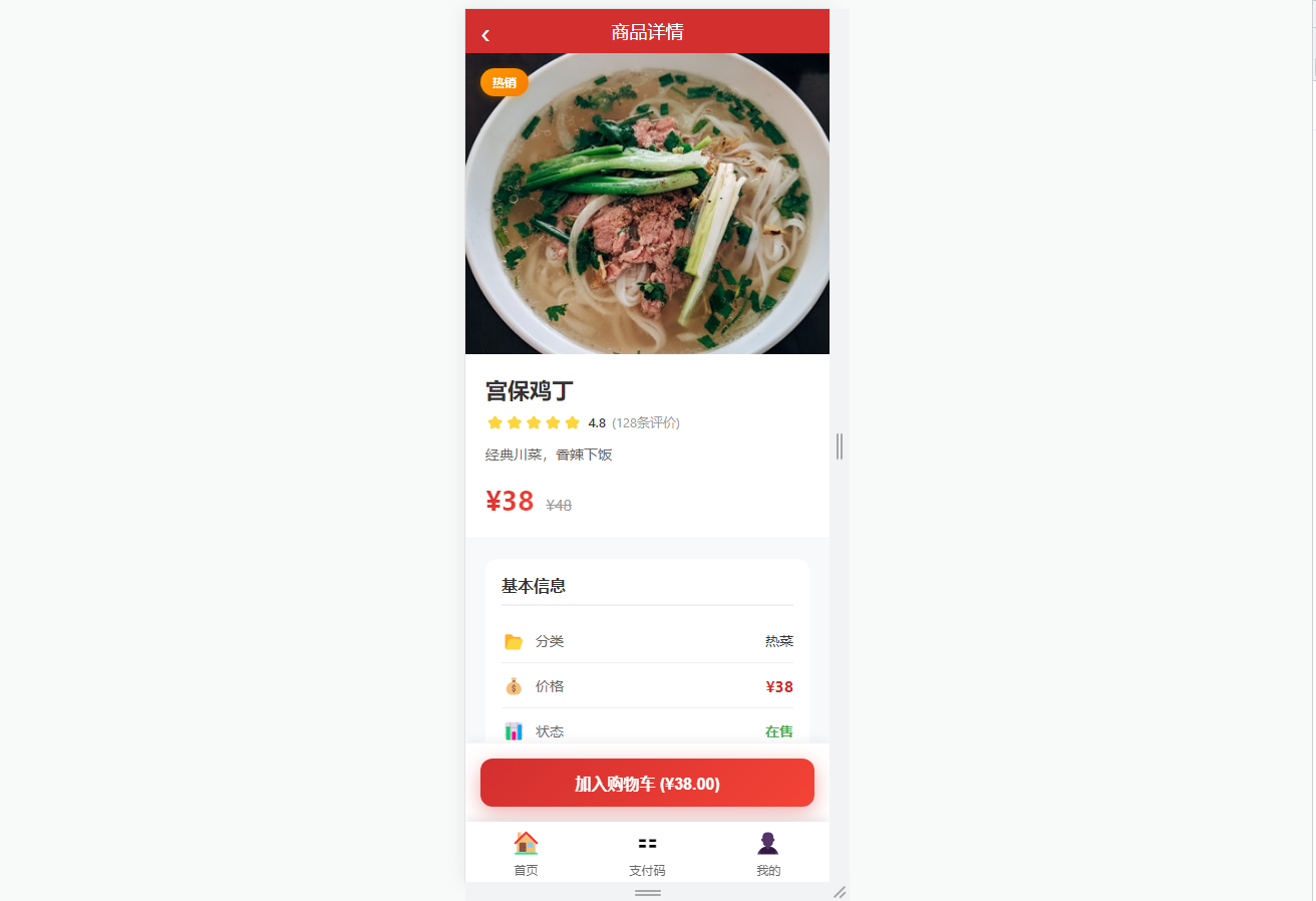 ● 堂食点餐功能:按热菜/冷菜等分类浏览菜品,展示商品图片、价格及库存状态,详情页呈现评分、营养成分等信息,购物车实时计价并支持一键提交订单