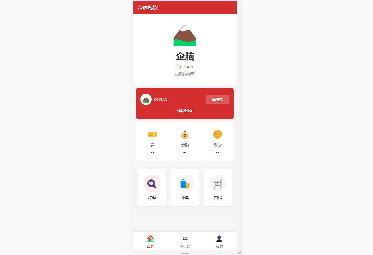● 首页综合服务:展示餐厅品牌形象,支持手机号登录并显示个性化信息,提供点餐、外卖、自提三大功能快速入口,动态适配登录状态