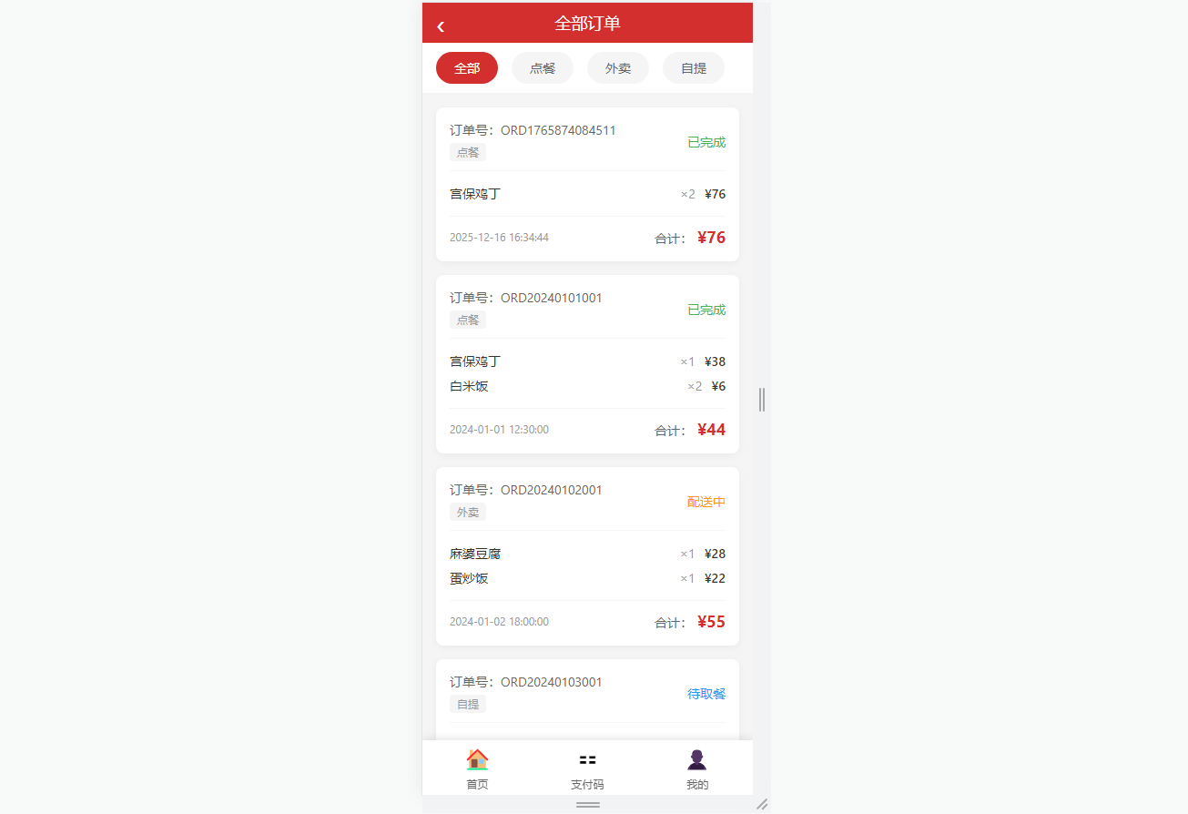 ● 全维度订单管理:按类型(点餐/外卖/自提)和状态(待支付/配送中等)筛选订单,不同状态订单匹配对应操作(支付/取消/确认取餐)