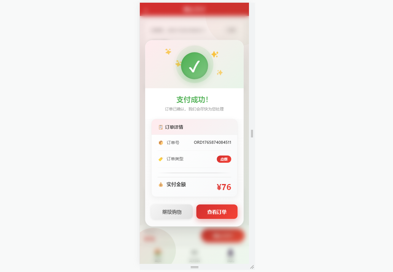 ● 多渠道支付系统:支持余额、微信、支付宝三种支付方式,支付弹窗清晰展示金额与方式,支付成功后弹窗提示并跳转订单列表