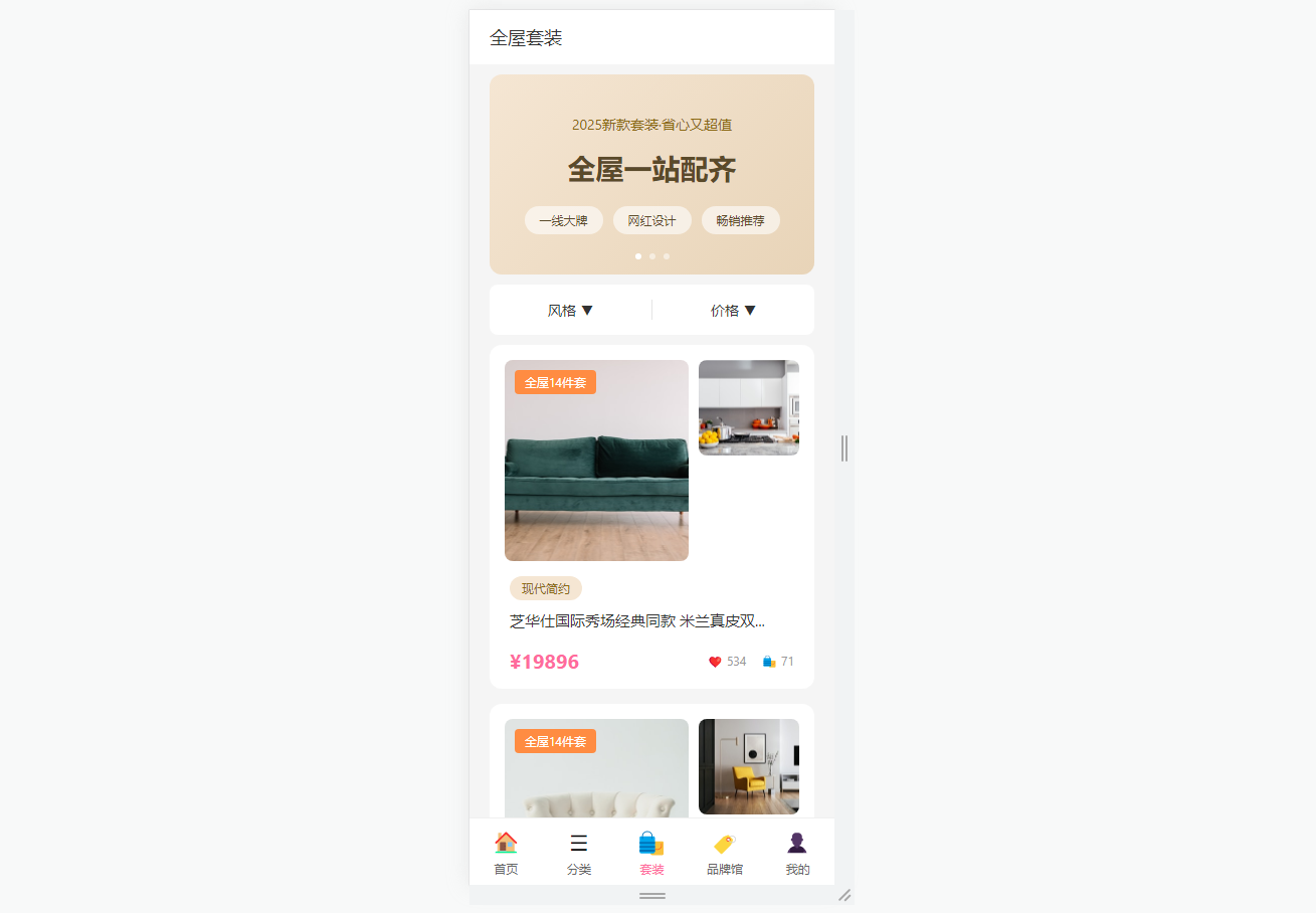 ● 商品分类与全屋套装:左侧固定10大主分类边栏,点击自动平滑滚动至对应内容;全屋套装支持风格/价格筛选,展示套装主副图、标签、价格及互动数据