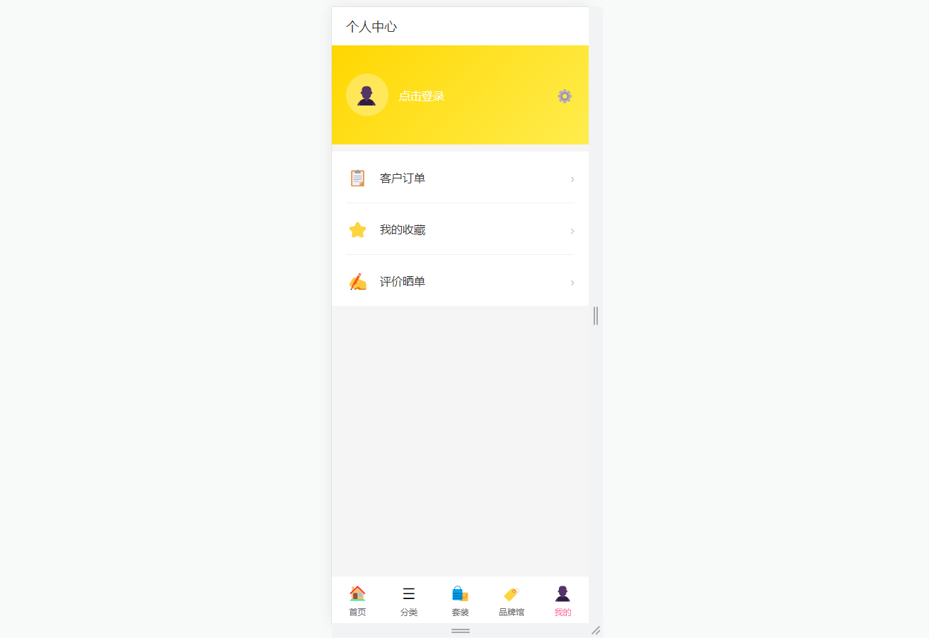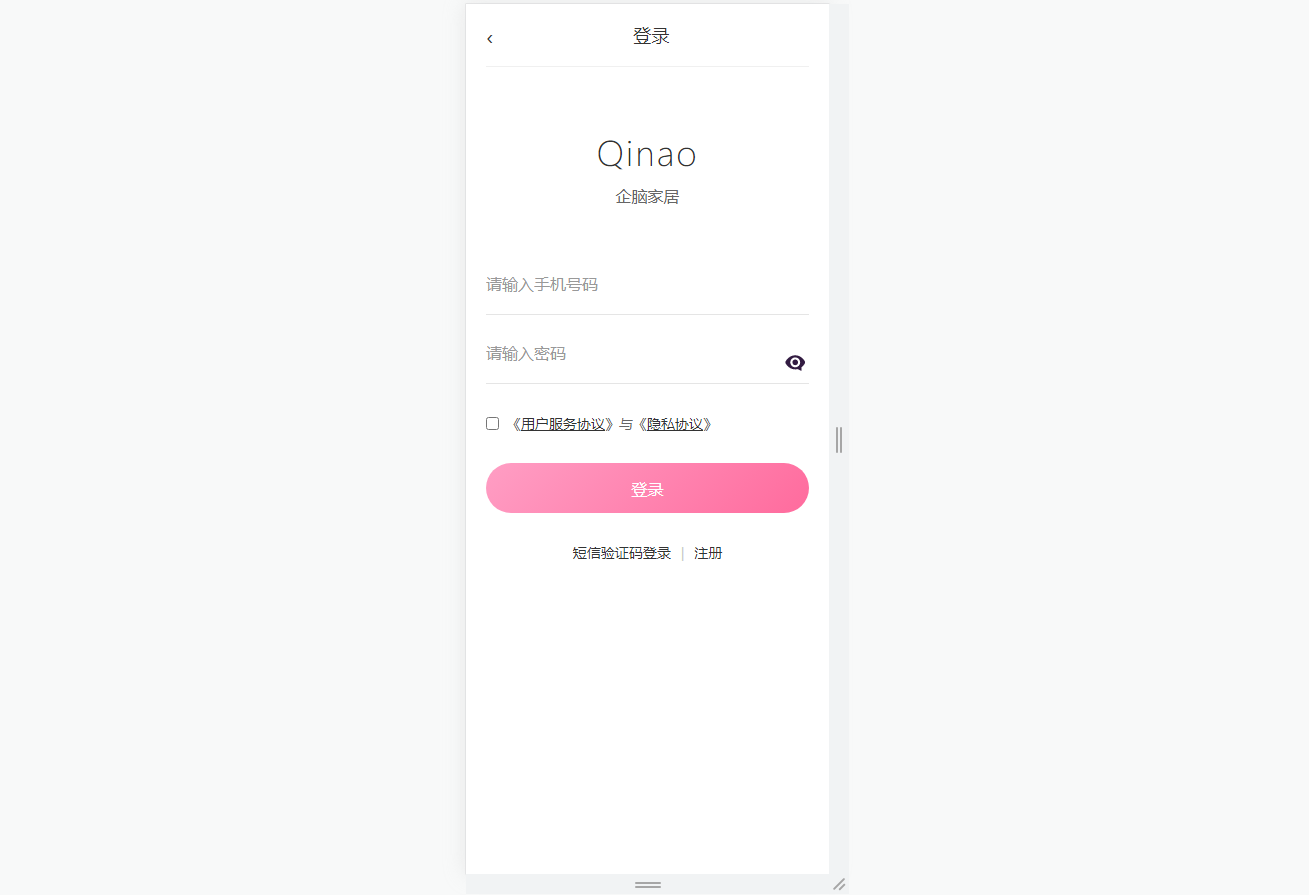 ● 个人中心与登录:支持手机号密码/短信验证码登录及注册,提供订单、收藏、评价功能入口,未登录状态显示占位头像与登录提示