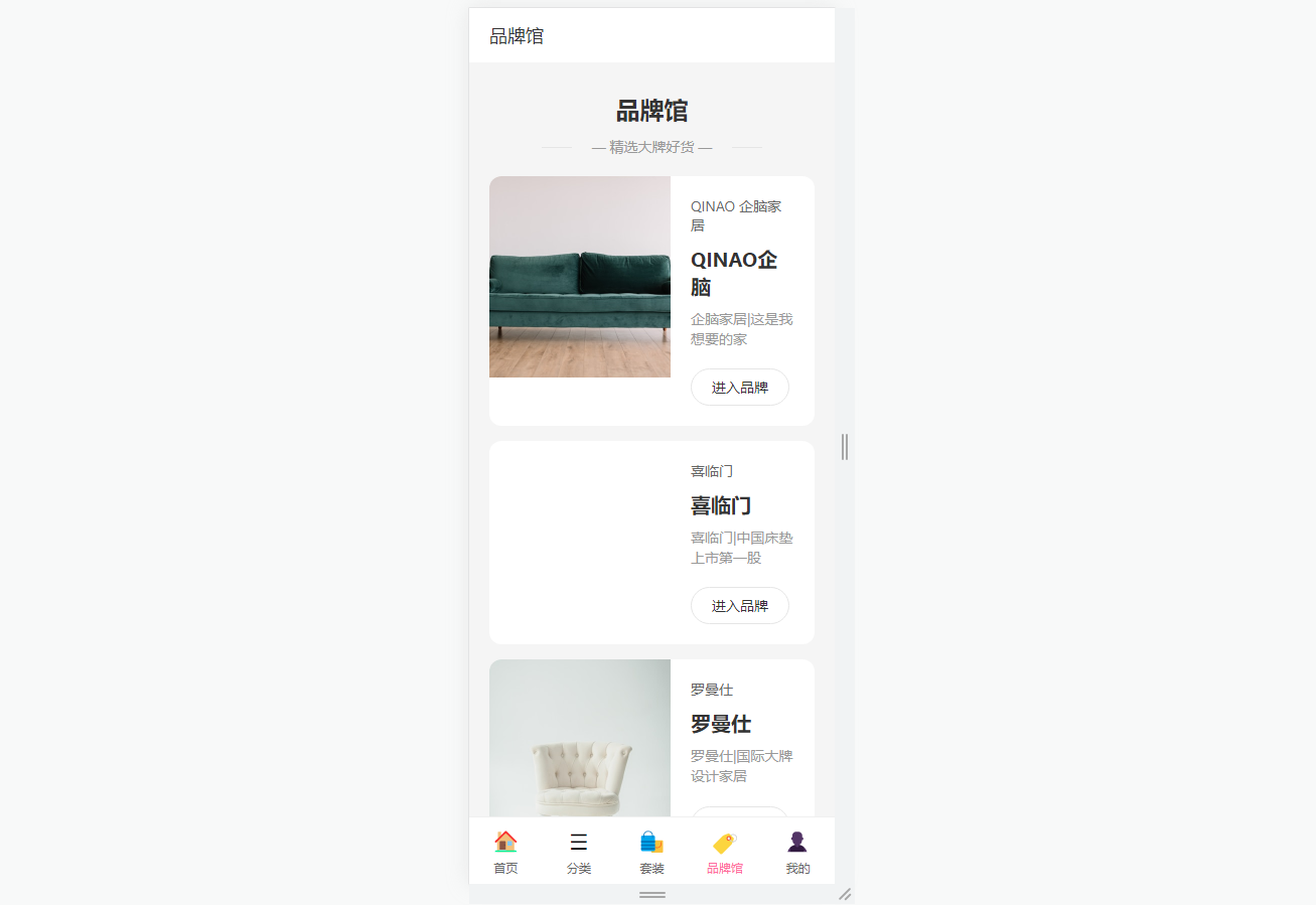 ● 品牌资源丰富:接入喜临门等知名家居品牌,展示品牌服务评级与保障信息,增强用户消费信任度