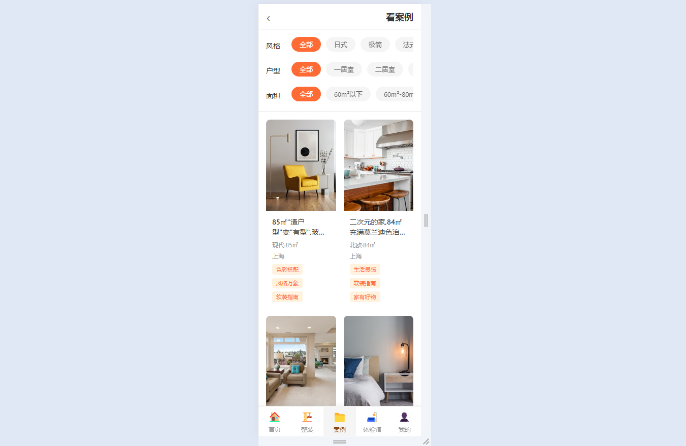 ● 案例浏览筛选:支持按风格、户型、面积多维度筛选,案例卡片展示图片、风格、面积等信息,带特色标签,点击可查看详情
