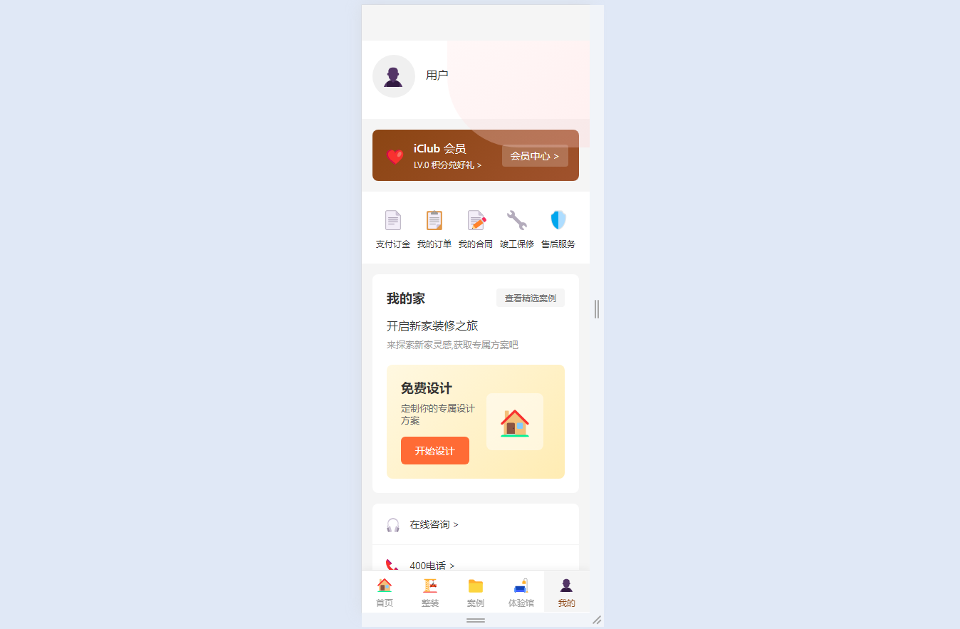 ● 个人中心管理:支持手机号+密码/验证码登录,会员系统展示等级与积分兑换,订单管理涵盖订金支付、合同管理等,提供免费设计、在线咨询等功能入口