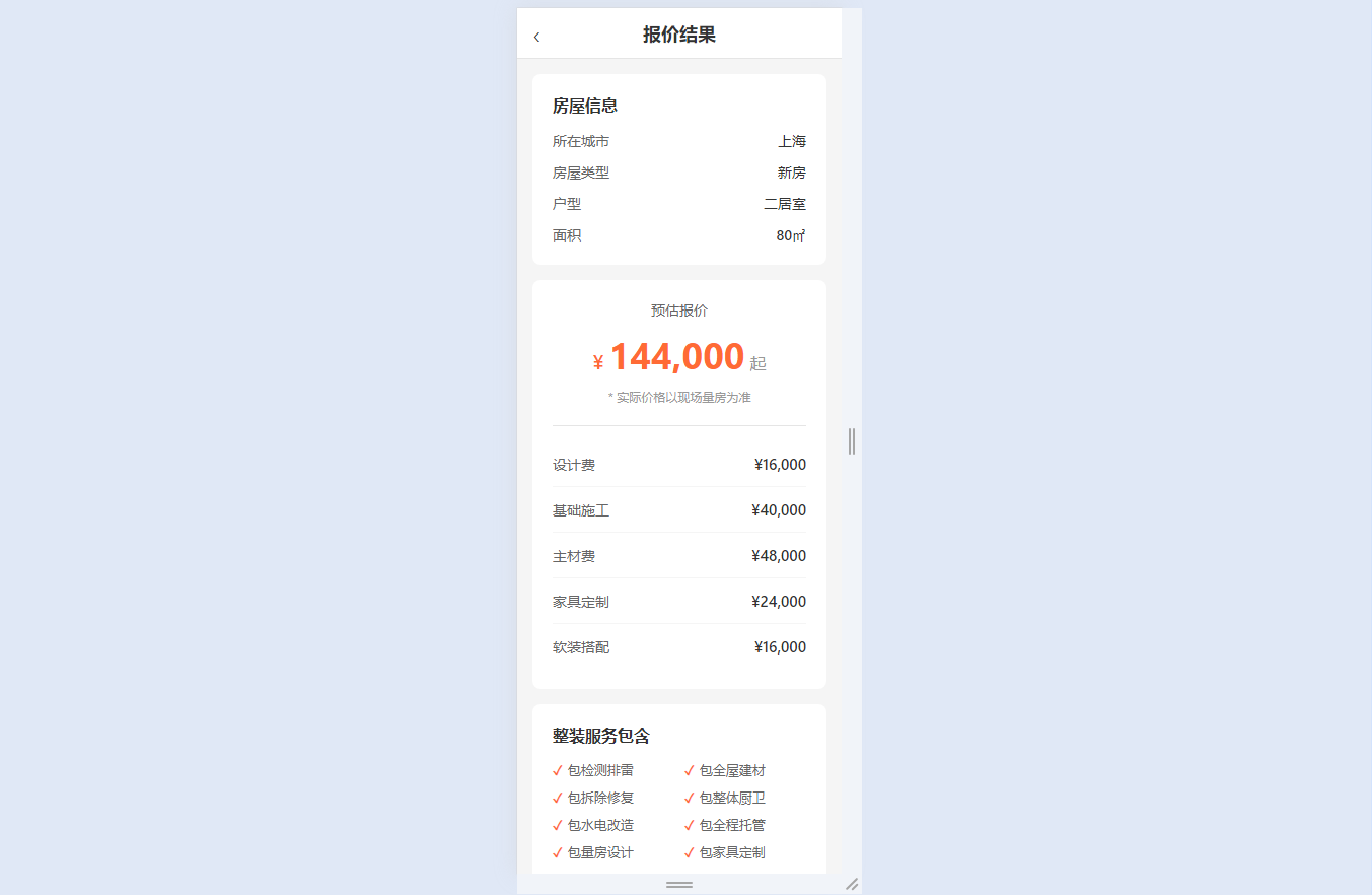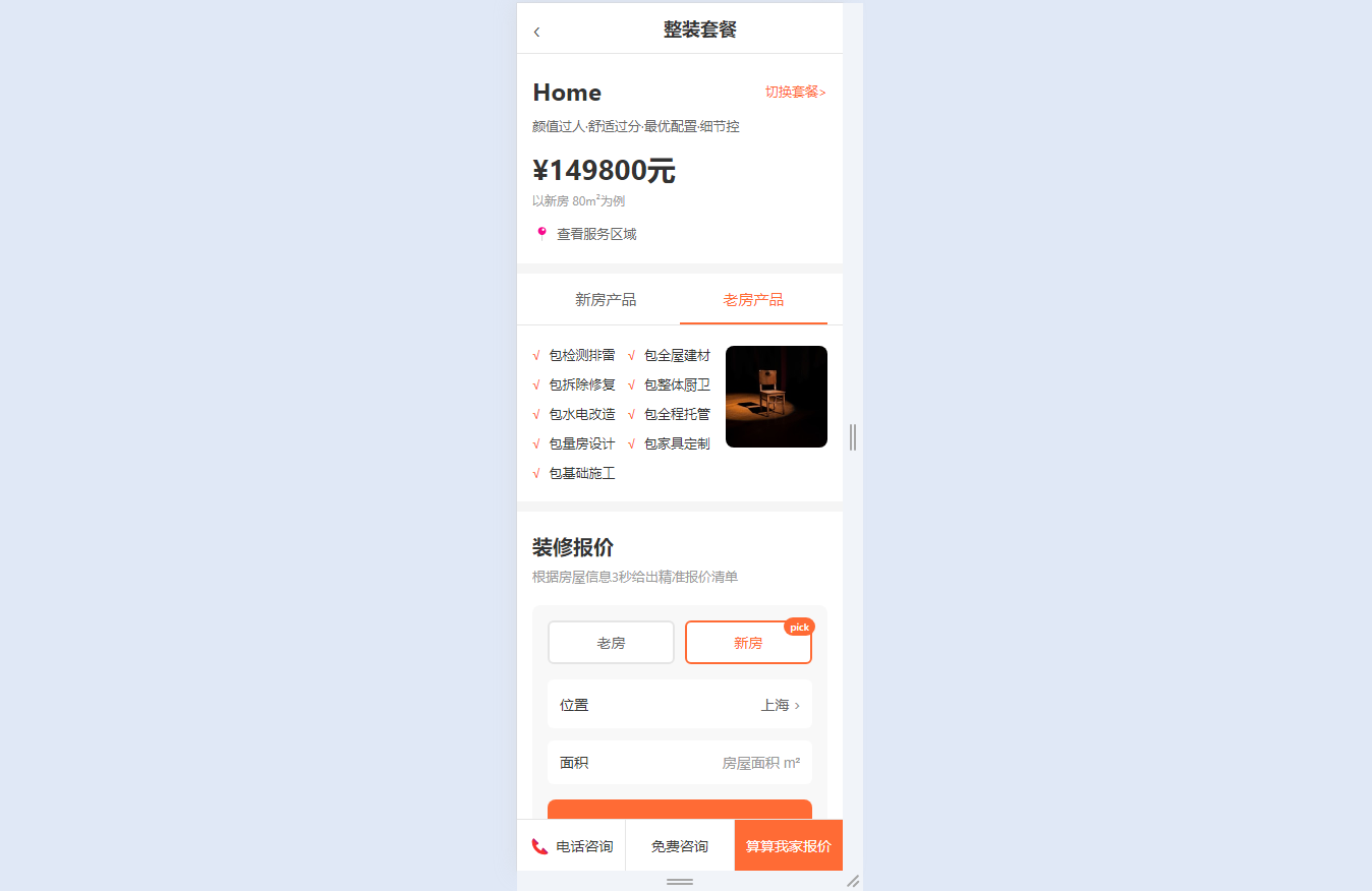 ● 智能报价系统:填写城市、房屋类型等信息,快速生成包含设计费、施工费等明细的报价清单,支持保存报价与联系顾问咨询