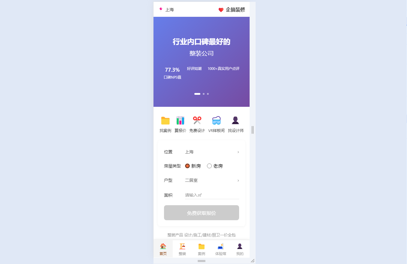 ● 首页综合服务:展示品牌口碑数据与服务统计,智能报价表单3秒生成预算,功能导航覆盖找案例、免费设计等核心需求,展示整装产品与城市体验馆信息,精选装修案例带标签分类