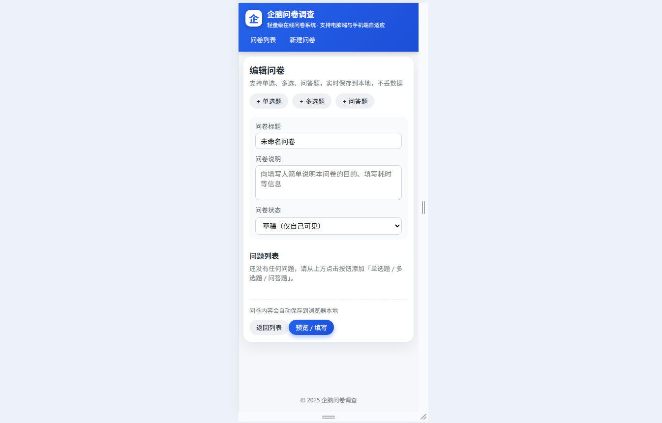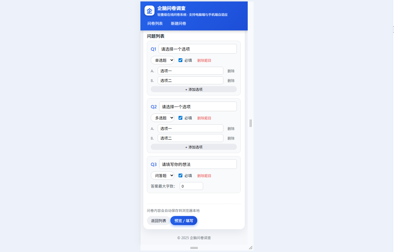 ● 问卷编辑:快速新建/编辑问卷,支持单选/多选/问答三种题型,可设置题目必填、管理选项、限制问答题字数,配置问卷说明,编辑内容自动本地保存