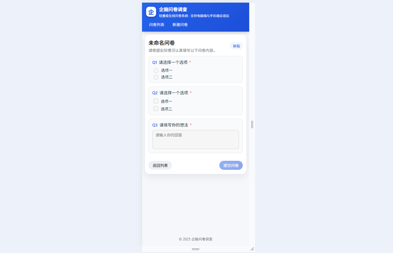 ● 问卷填写:多端自适应显示,必填题目提交前自动校验,仅已发布问卷可提交,草稿/关闭状态禁用提交按钮