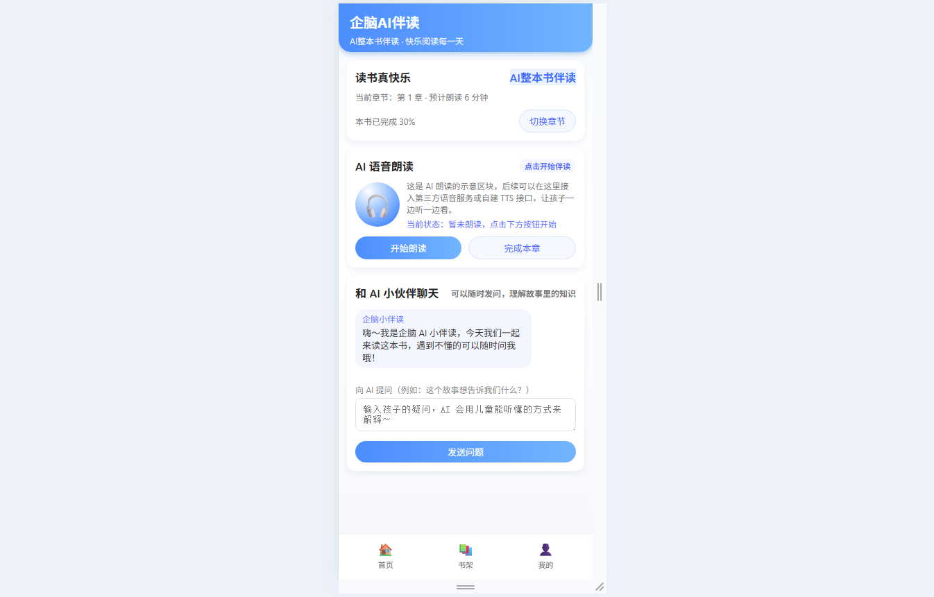 ● AI整本书伴读核心:提供开始/暂停朗读控制,预留TTS语音合成接口,支持孩子随时向AI小伙伴提问并获得儿童化语言回应,可切换章节并标记“完成本章”追踪阅读进度