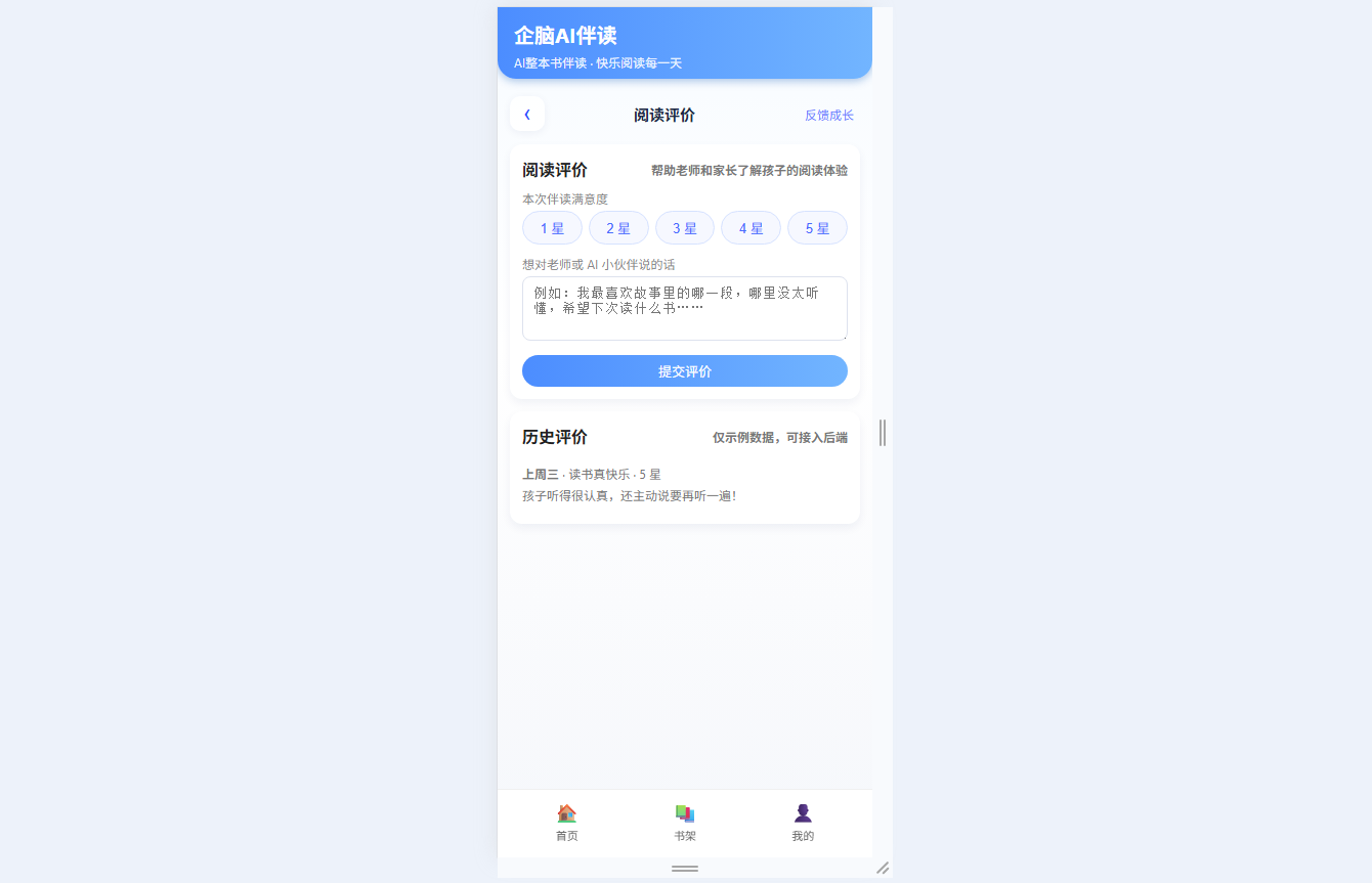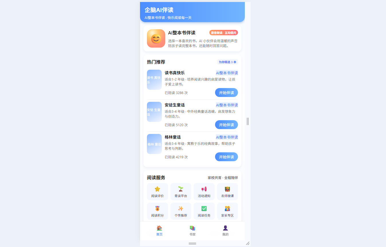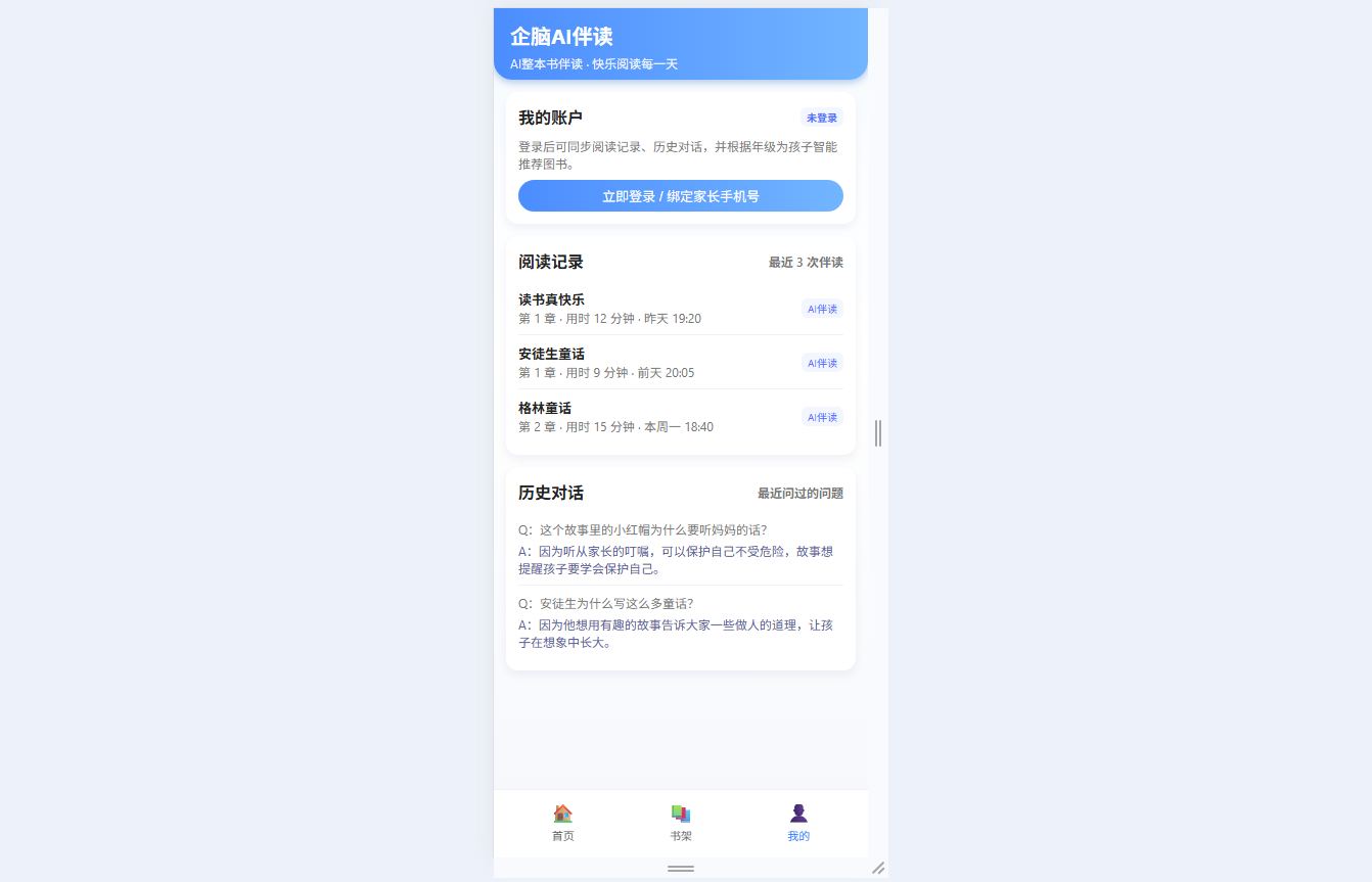 ● 儿童友好设计:移动端卡片式UI布局,轻量操作路径,重点突出“开始伴读”与“随时提问”核心功能,适配孩子操作习惯