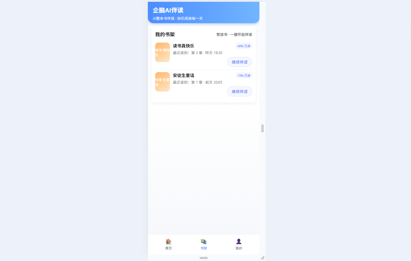 ● 书架管理功能:展示常读书籍、阅读进度与最近阅读记录,支持一键继续伴读,快速恢复阅读状态