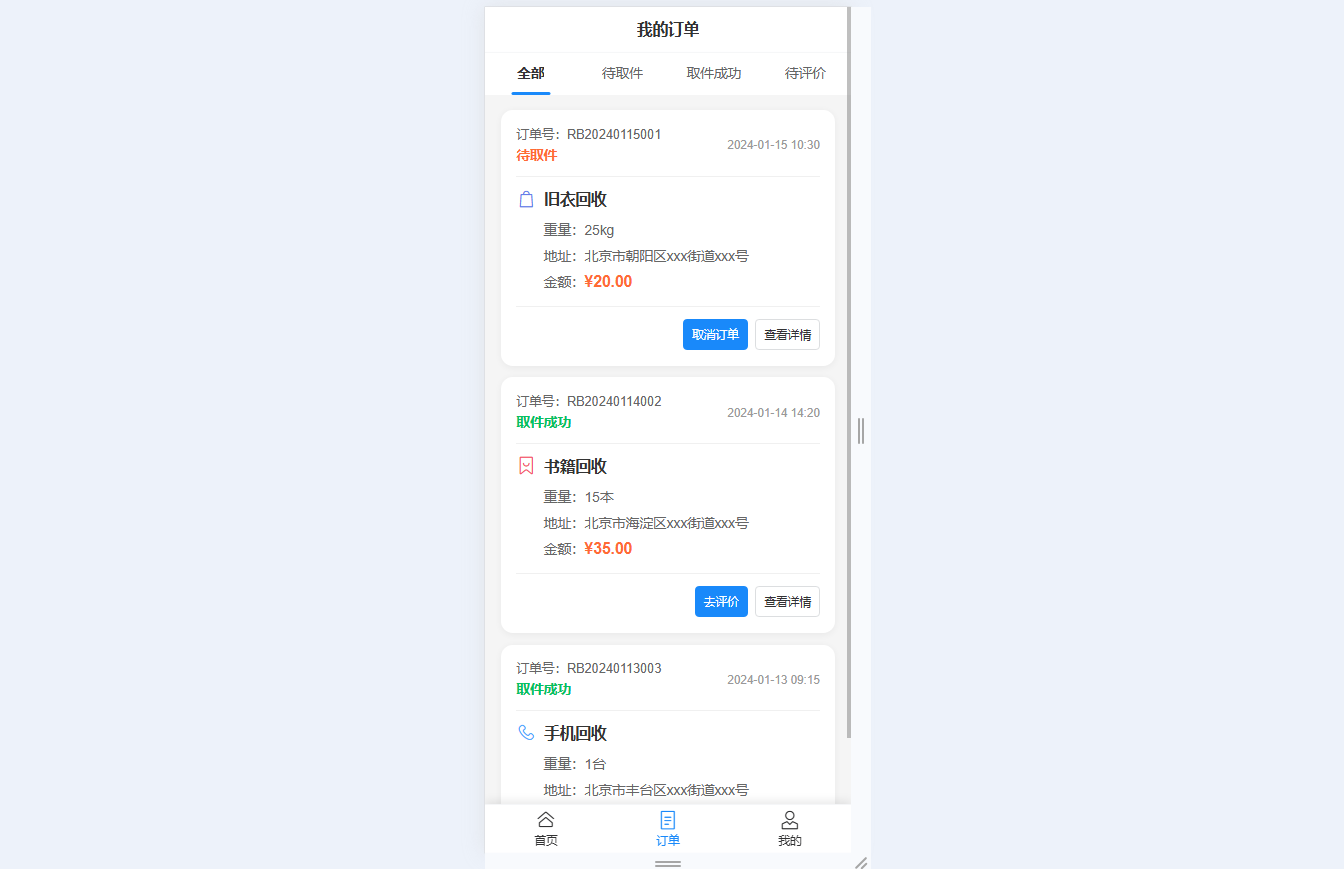 ● 功能闭环完整:覆盖预约-取件-付款-评价全回收流程,支持多品类回收与商品订单管理,满足环保与消费双重需求