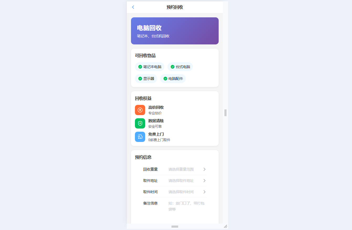 ● 移动端体验优异:完美适配各类手机屏幕,响应式设计保障流畅交互,底部导航栏快速切换功能,回收流程直观易懂
