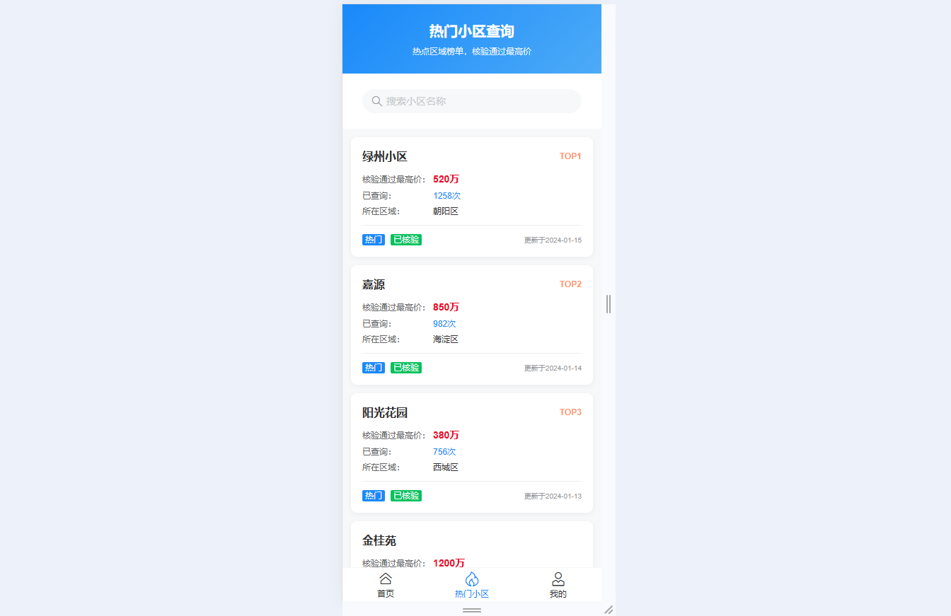 ● 热门小区查询:展示热点区域小区榜单,标注核验通过最高价与查询次数,TOP排名呈现,提供区域房价水平参考,辅助购房决策