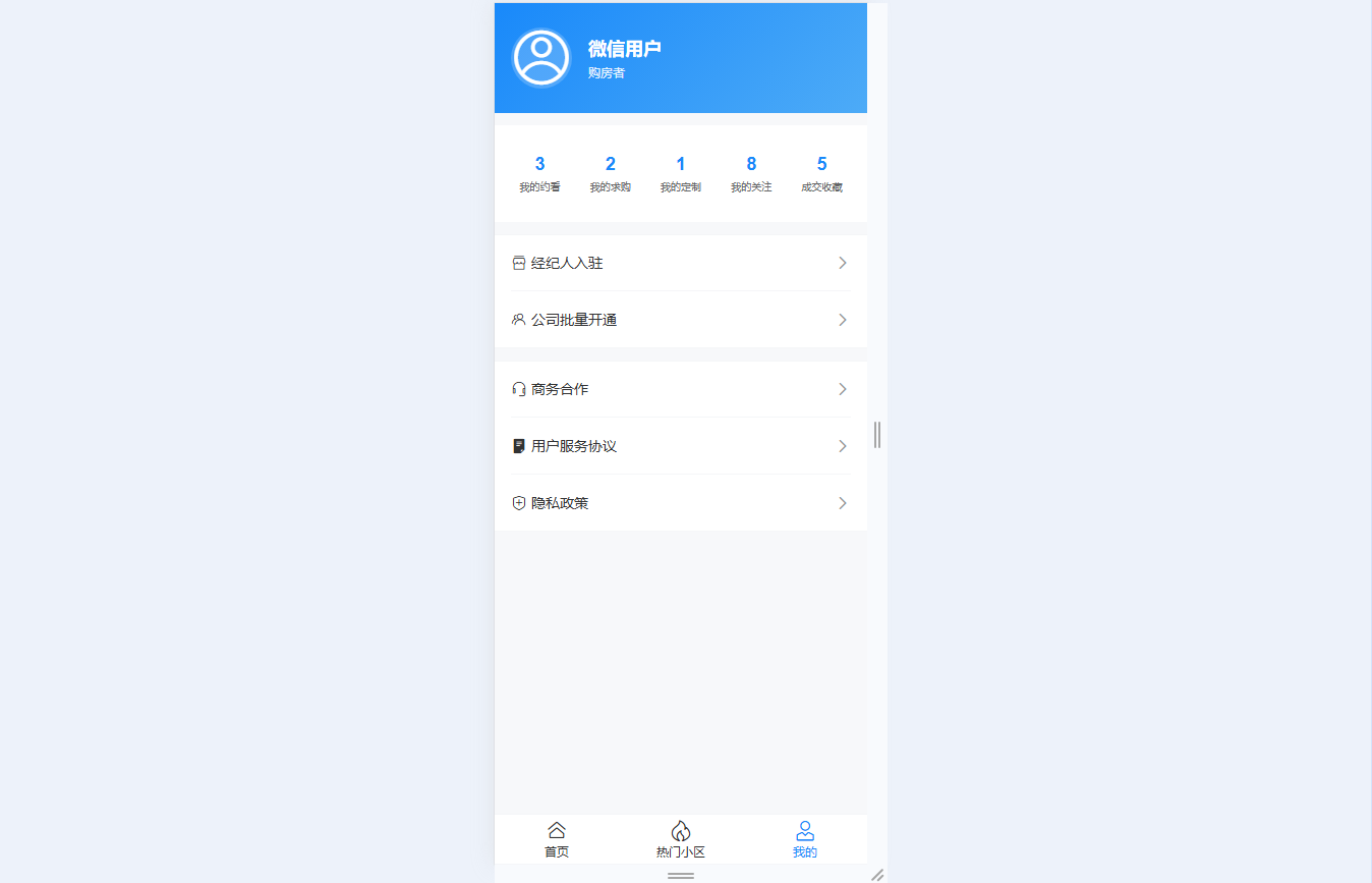 ● 个人中心管理:显示用户昵称与身份,统计我的约看、求购、定制等数据,支持房源与成交案例收藏,提供经纪人入驻与公司批量开通入口,可查阅服务协议与隐私政策