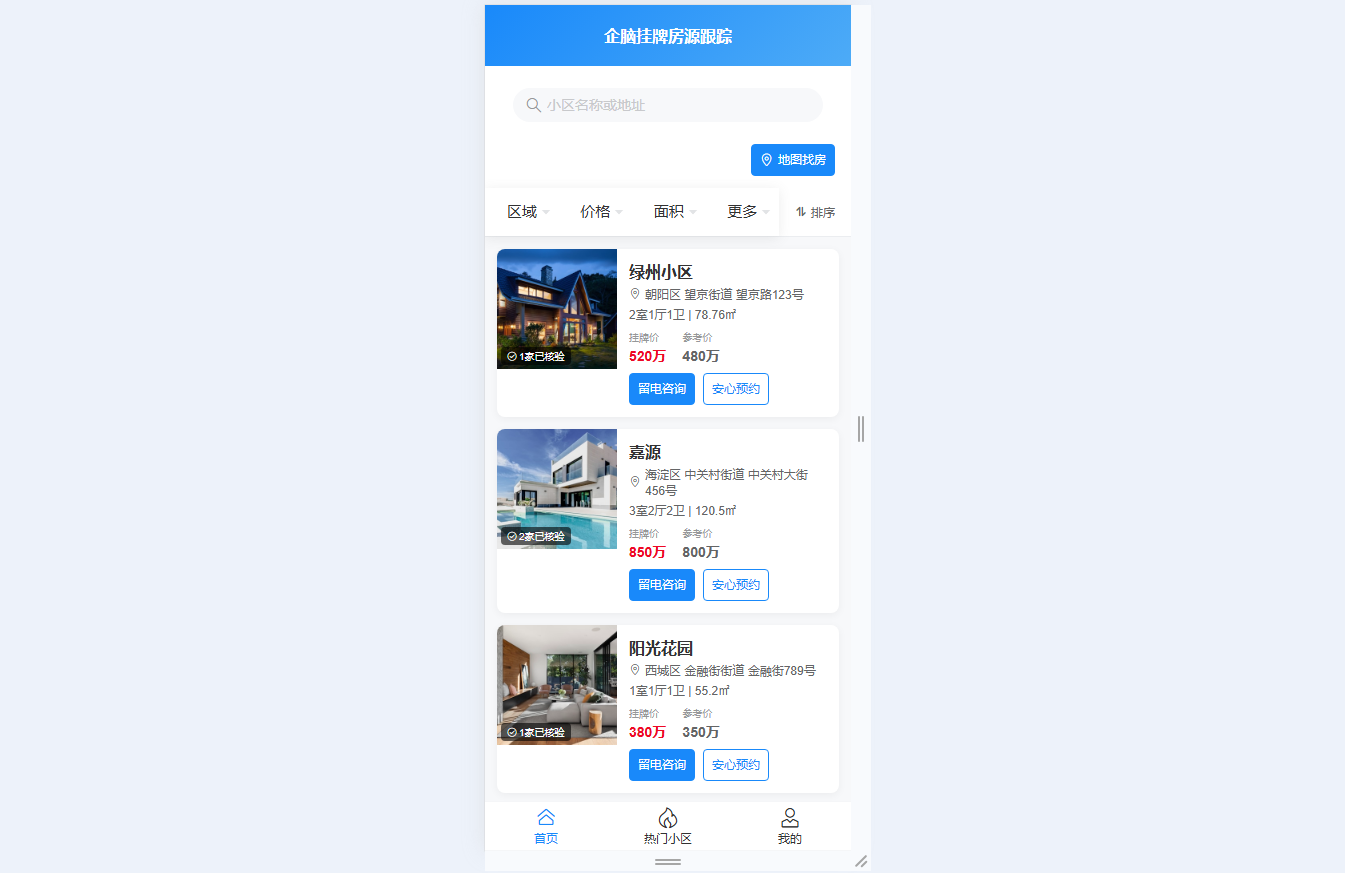 ● 首页房源搜索浏览:支持小区名称/地址文本搜索与地图找房,多维度筛选(区域/价格/面积等),多种智能排序方式,展示挂牌价与参考价双价格,配备高清实景图片与核验标识,支持留电咨询与安心预约