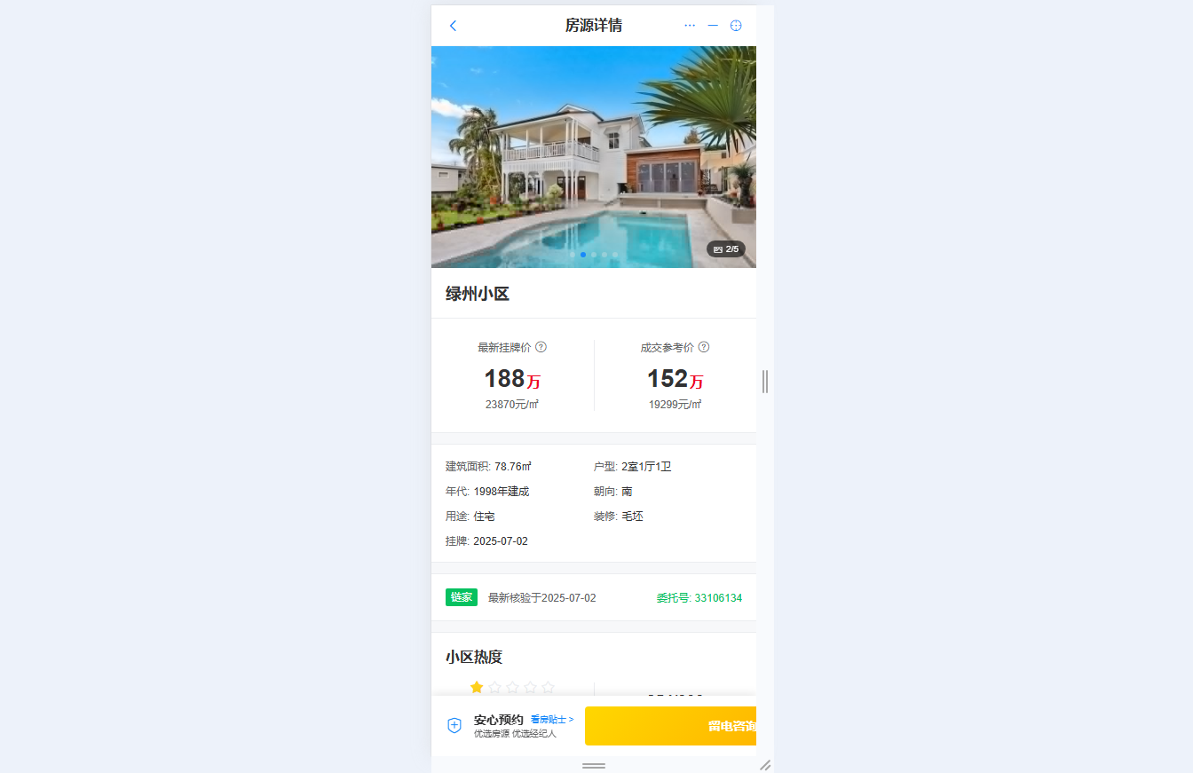 ● 信息丰富全面:每个房源配备多张高清实景图片,完整展示户型、面积等核心信息,同步提供小区热度、成交排名等数据支撑