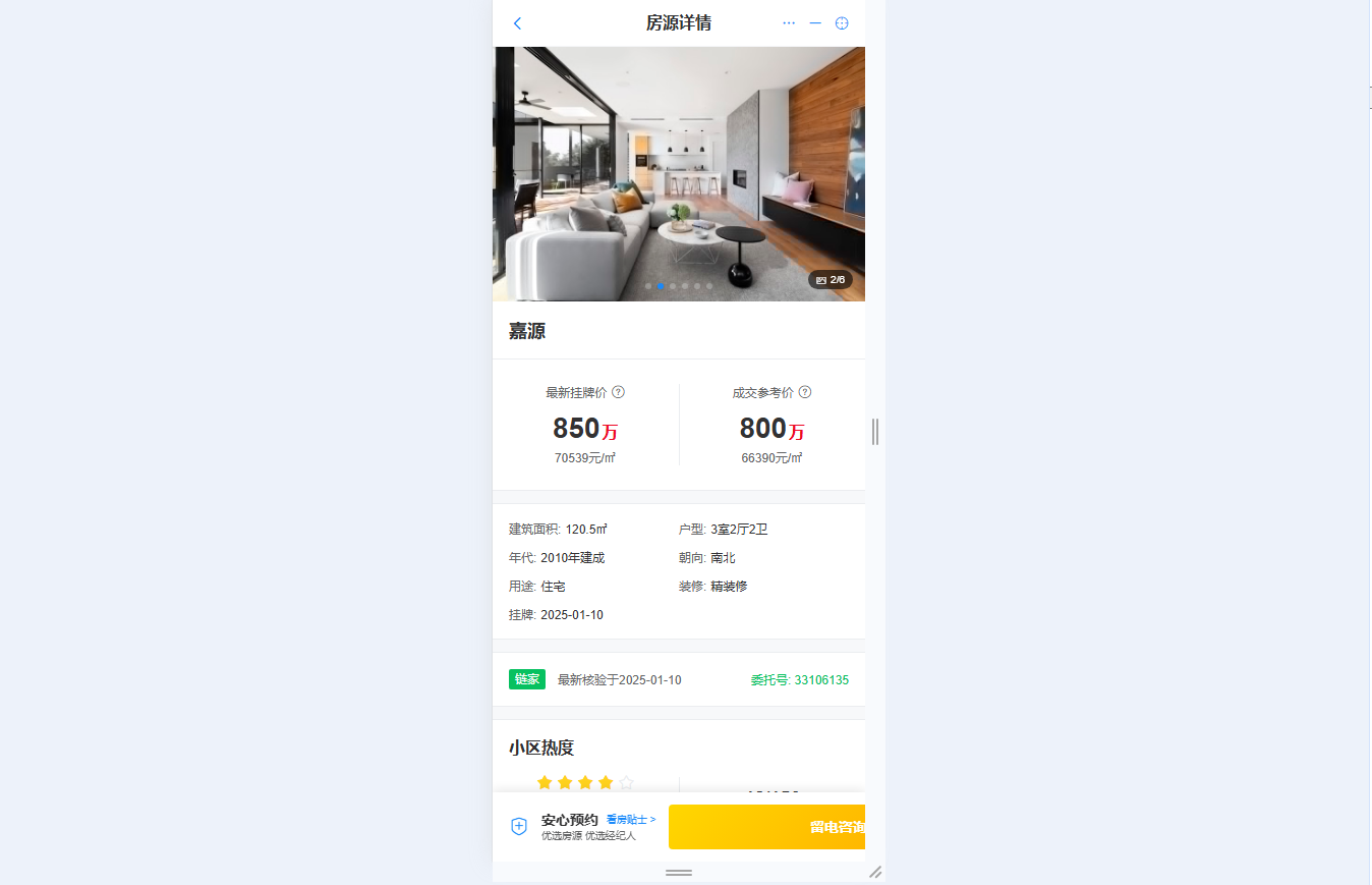 ● 数据驱动决策:房源信息实时更新,展示查询次数、核验次数等数据,基于大数据计算成交参考价,为购房决策提供科学依据