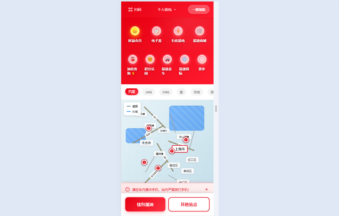 ● 加油服务 涵盖汽柴LNG CNG氢能充电换电司机之家等多种燃料和服务类型 支持钱包加油 可管理账户余额 进行100/200/500/1000元快捷充值 查询交易记录 实现提现操作