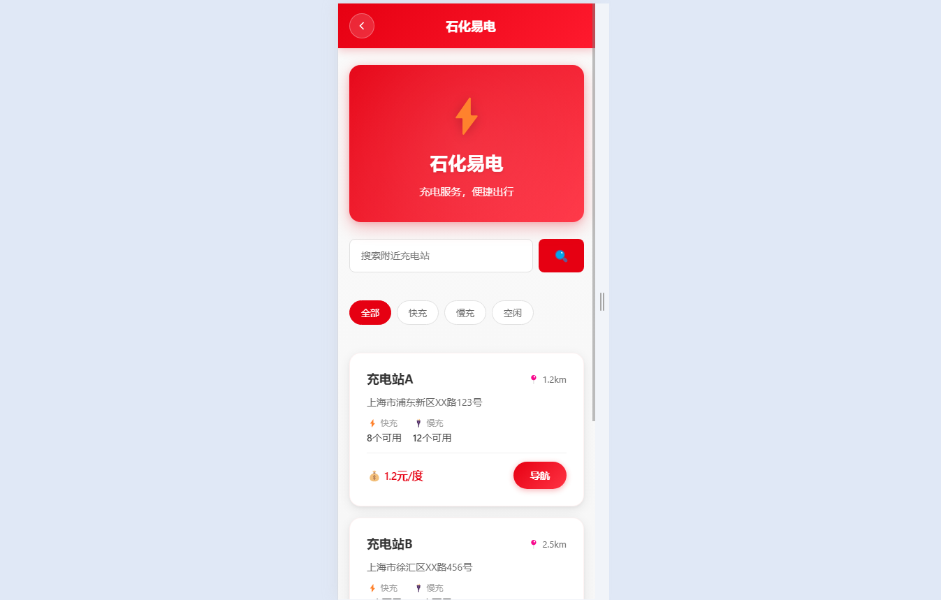 ● 石化易电充电服务 查找附近充电站 筛选快充慢充类型 显示空闲充电桩数量 展示充电站实时可用桩数充电价格距离地址信息 支持一键导航
