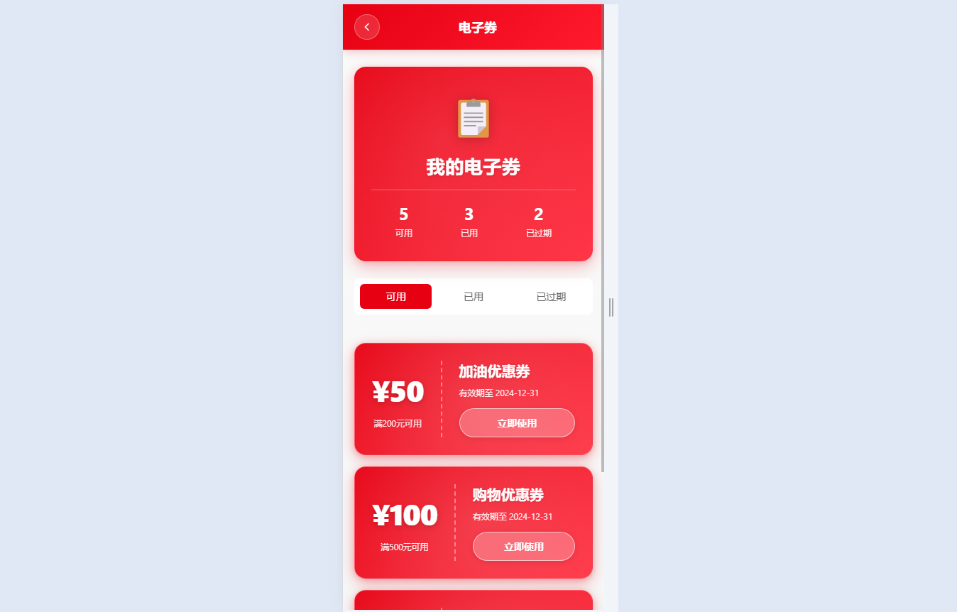 ● 电子券服务 管理可用券已用券 提醒过期券 涵盖加油购物洗车等多种优惠券类型 统计可用已用已过期优惠券数量