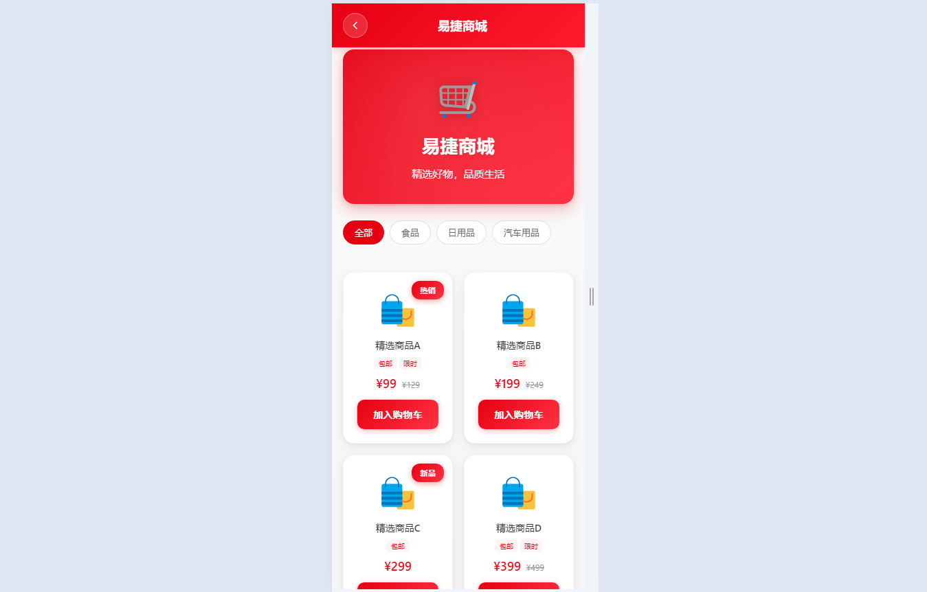 ● 易捷商城 商品分类覆盖全部商品食品类日用品汽车用品 商品展示标注热销新品包邮限时等标签 呈现商品图片描述价格和优惠信息 支持加入购物车和查看商品详情