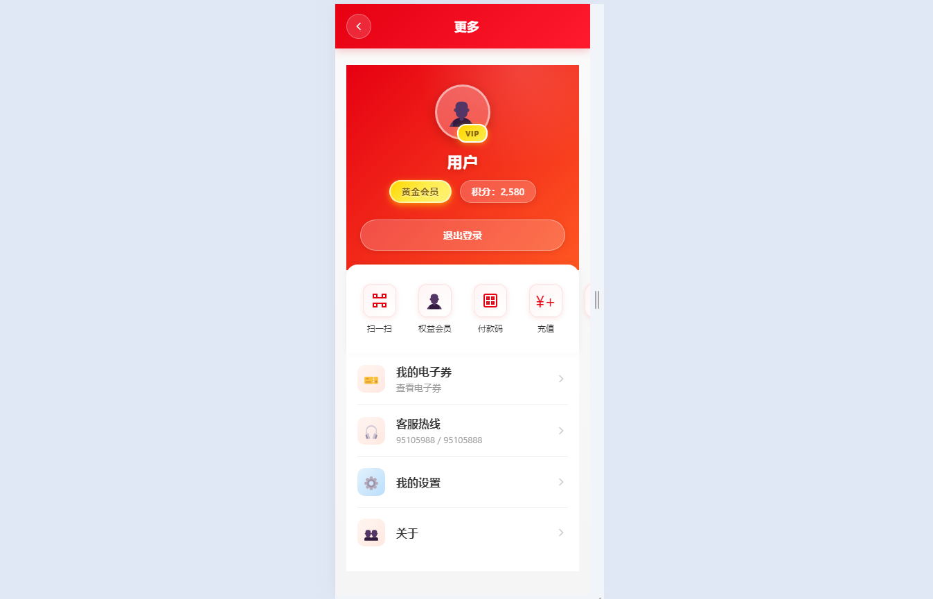 ● 更多服务 支持扫一扫权益会员付款码充值账单等快速访问功能 提供我的电子券客服热线我的设置关于等功能入口