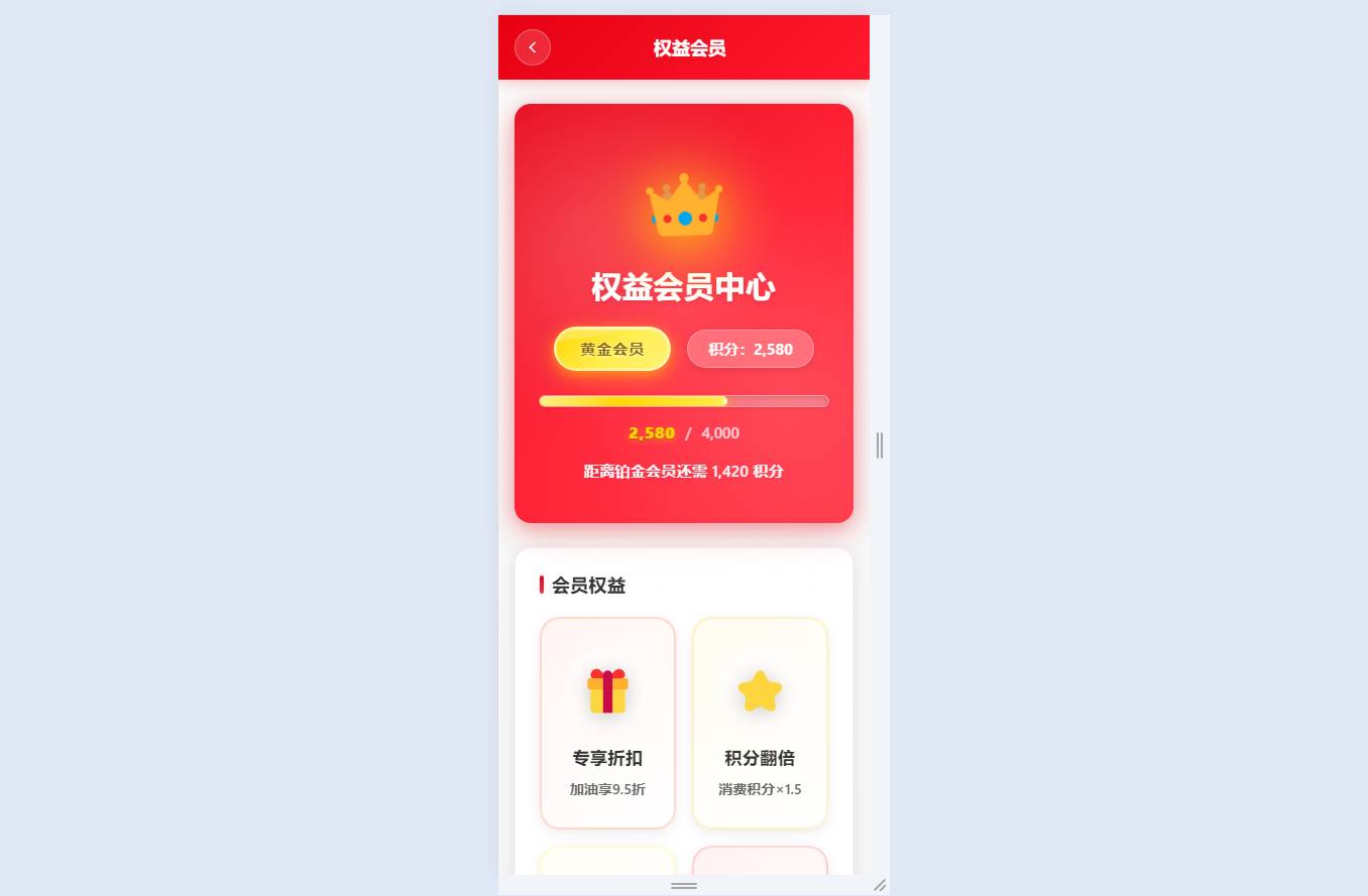 ● 权益会员系统 设立黄金铂金会员等级 搭建会员积分体系 会员专享加油9.5折优惠 消费积分1.5倍翻倍 每月领取3张专属优惠券 享受每月2次免费洗车服务 支持积分查询兑换抽奖 接入积分商城