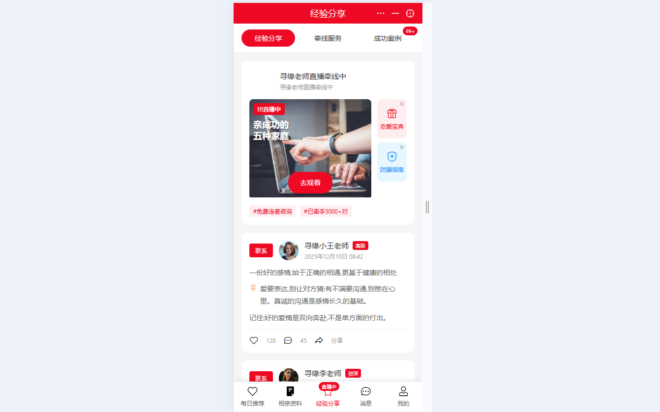 ● 经验分享社区 展示相亲成功案例、情感建议,支持点赞、评论、分享内容,可联系牵线老师获取指导