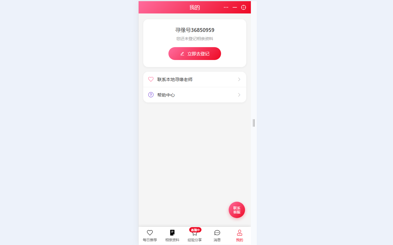● 个人中心管理 查看寻缘号、登记相亲资料,联系本地牵线老师,访问帮助中心解决问题