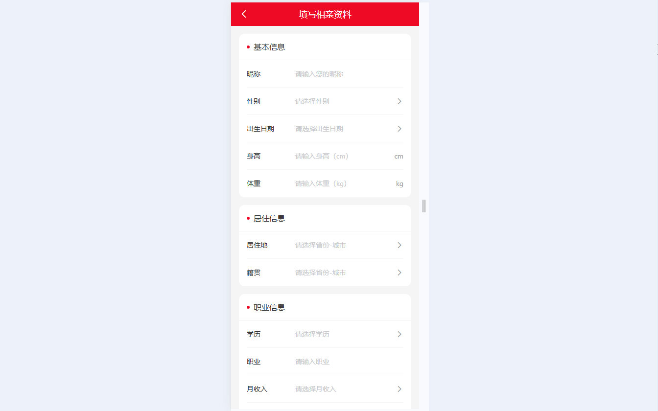 ● 相亲资料填写 支持完善昵称、性别、出生日期、身高体重等基本信息,选择居住地、籍贯,填写学历、职业、月收入等详细资料