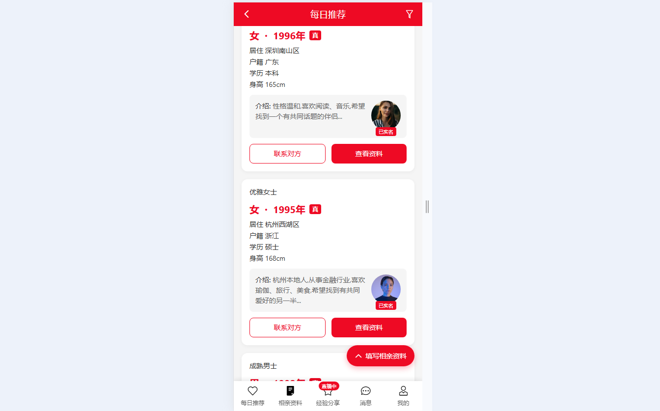 ● 每日推荐匹配 基于筛选条件展示相亲对象卡片,包含年龄、居住地、学历、身高及个人介绍,支持联系对方、查看资料