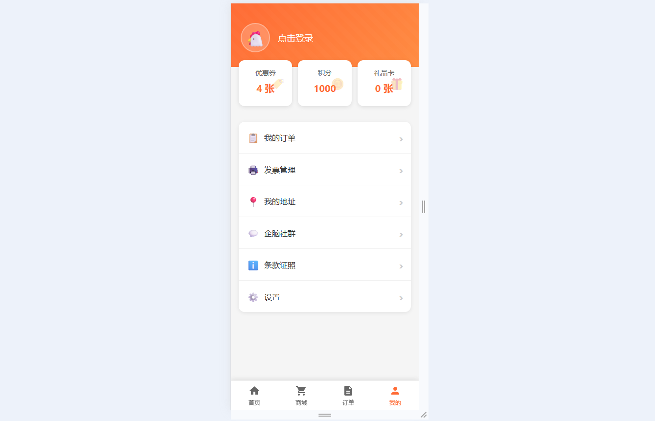● 个人中心 集中管理优惠券、积分、礼品卡等资产,支持订单查询、发票管理、地址维护等功能