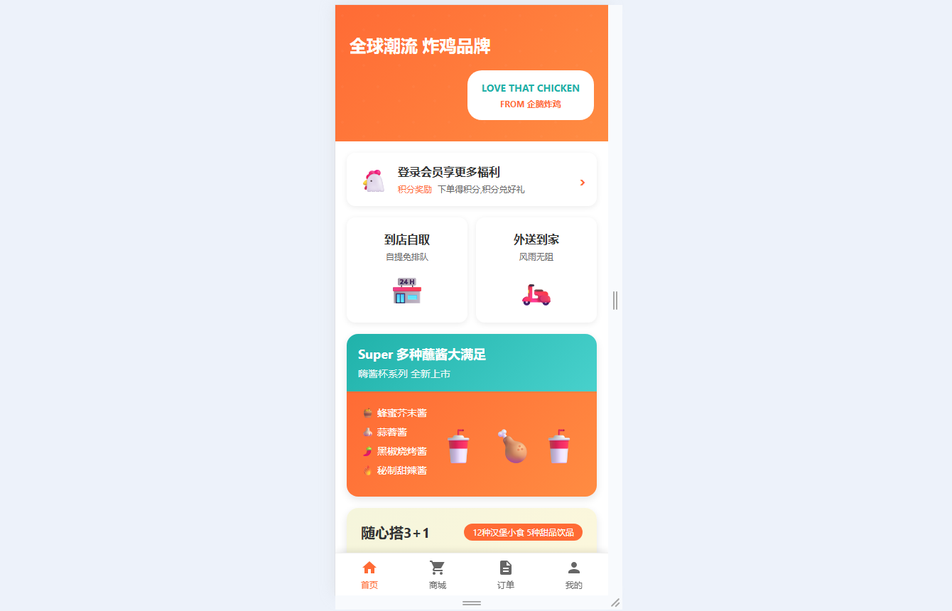 ● 服务选择 首页提供“到店自取/外送到家”双服务入口,外送模式关联地址管理,到店模式支持免排队点餐
