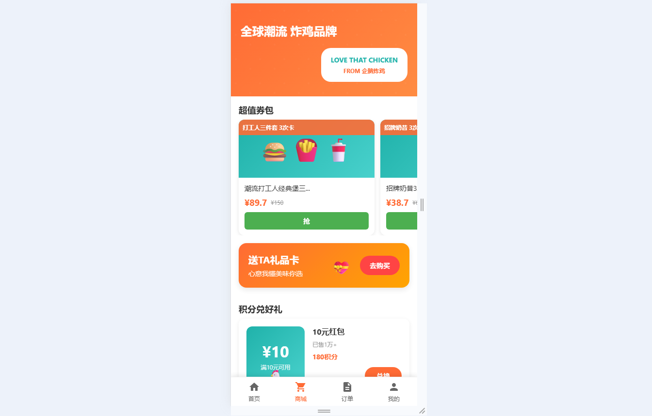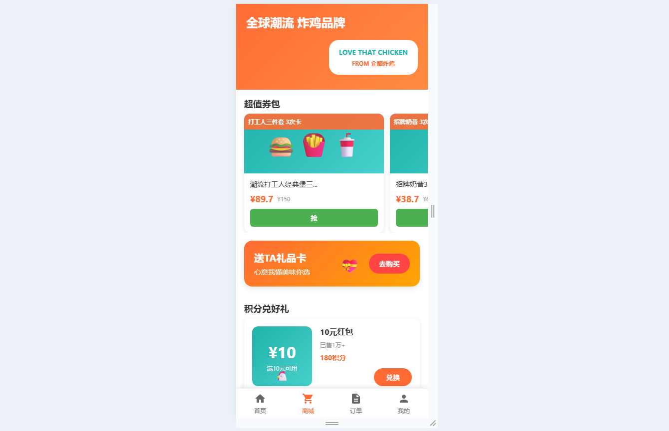 ● 商城营销 推出超值券包、礼品卡购买等活动,设置积分兑好礼专区,可使用积分兑换红包类福利