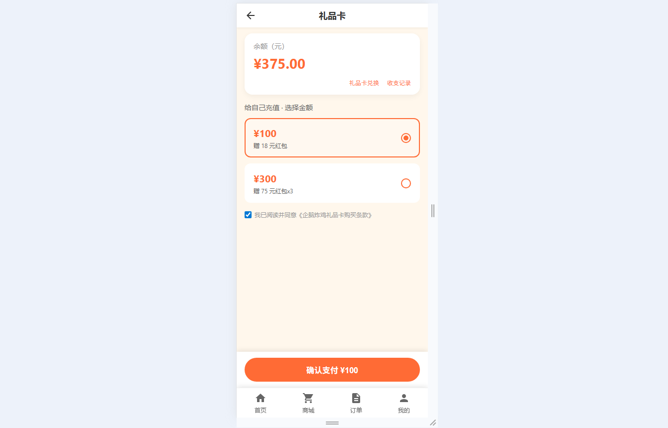 ● 礼品卡管理 展示礼品卡余额,支持100元/300元固定面额充值并附赠红包,可查看兑换与收支记录,确认支付后更新余额