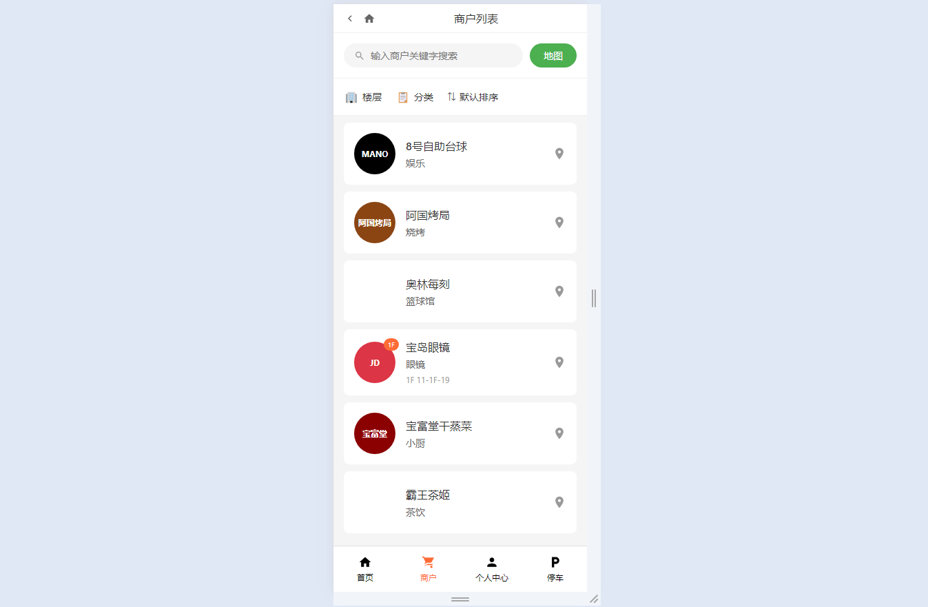 ● 商户服务平台 提供商户搜索地图查看功能 按楼层分类排序筛选商户 展示商户基本信息营业时间地址介绍 支持拨打电话查看位置收藏商户